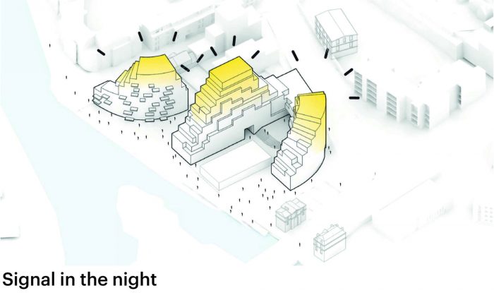 The façade reinforces the connection to geology. It features both matte and glossy ceramic panels in five different tones of grey, arranged into stratified layers: dark and mostly matte near to ground level, and lighter and glossier at the top levels. At night, lighting reinforces this effect, with more lights integrated into the ceramic panels at the top of the building. As a result, the design seems as if it truly belongs – an outgrowth of the environment itself, which feels natural even as it significantly densifies this part of the city.