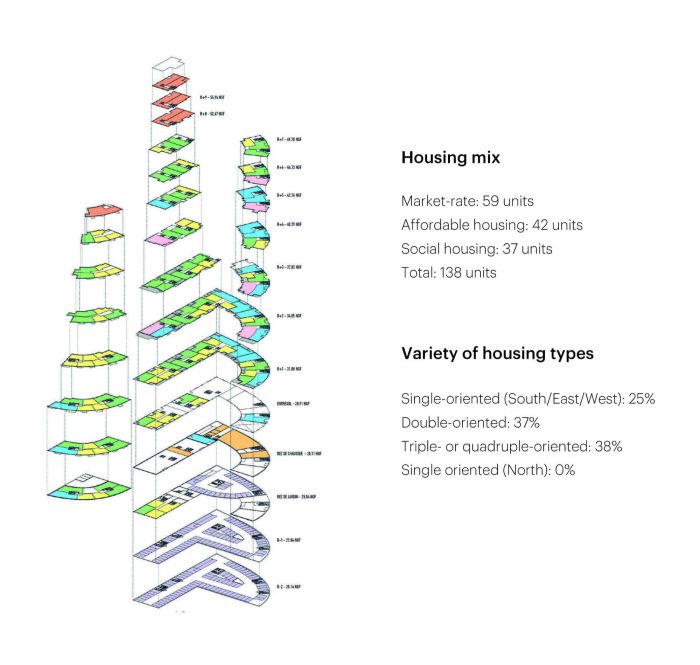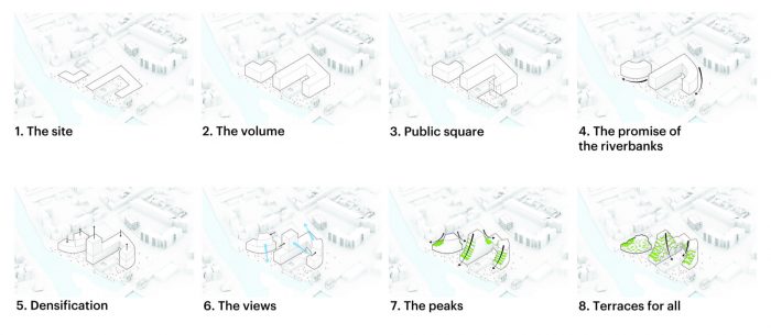 Ascension Paysagère takes inspiration from geological formations. The project comprises two curving buildings, one large and one small, with gradually receding slopes. By the river, and at points where the project approaches its neighbors, the buildings are low, acknowledging the expansive, low-rise context. Elsewhere, however, the design gradually steps up into three peaks, reaching the maximum 12-story height in the center of the site. The terraces created by these gradual step-backs are decked with pots filled with greenery, extending the lush atmosphere of the riverbank upwards to the apartments even at the very top of the building. On the western corner of the larger block, in between the building’s two ‘peaks’, a garden including fruit trees emphasizes this green approach.
