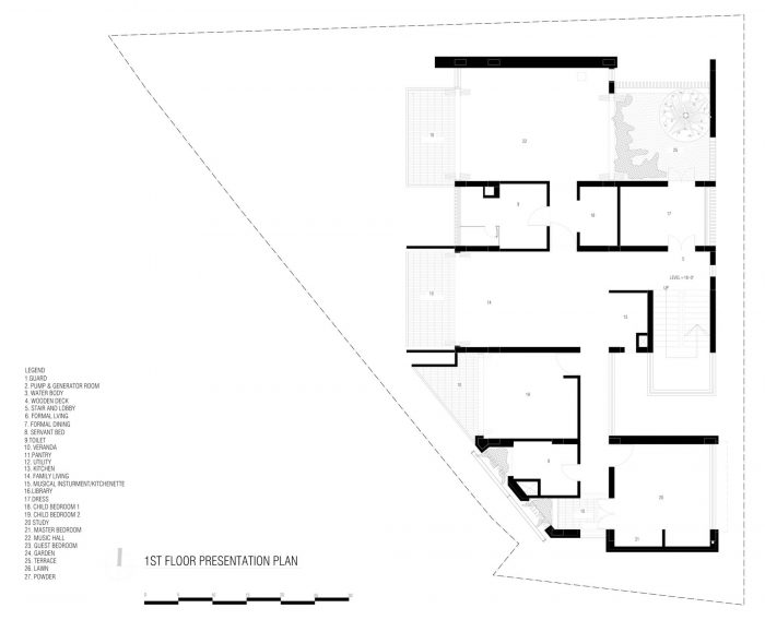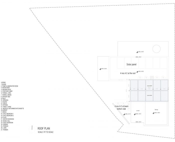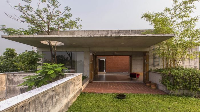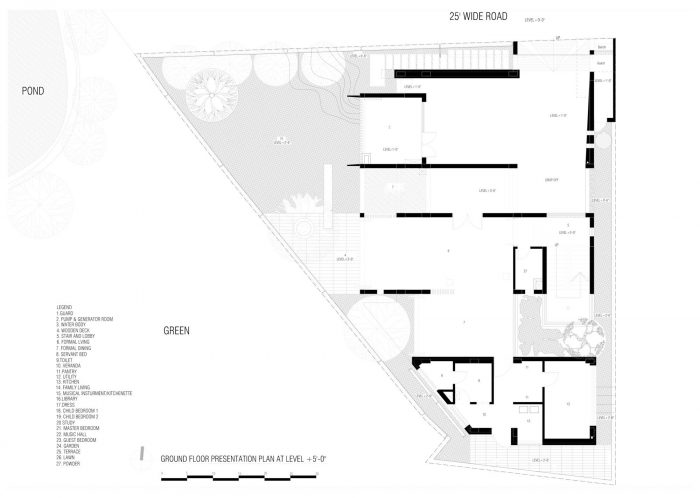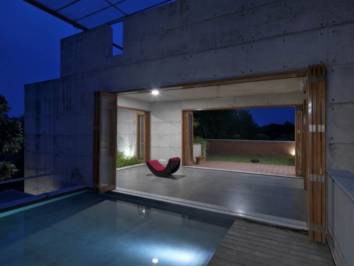 On the first floor there are bedrooms and the family living. The master bedroom opens outward to a green courtyard which is also accessible form the library. The guest room is situated on the second floor along with a Music hall. There is a water body which leads to the guest room. The music room/ family lounge opens Omni-directions and celebrates the water body on the south, sunsets on the west and the lawn on the north. The residence is built in a combination of exposed concrete. Thus, a soothing effect is evolved to match with regional climate and resistance against earthquake.