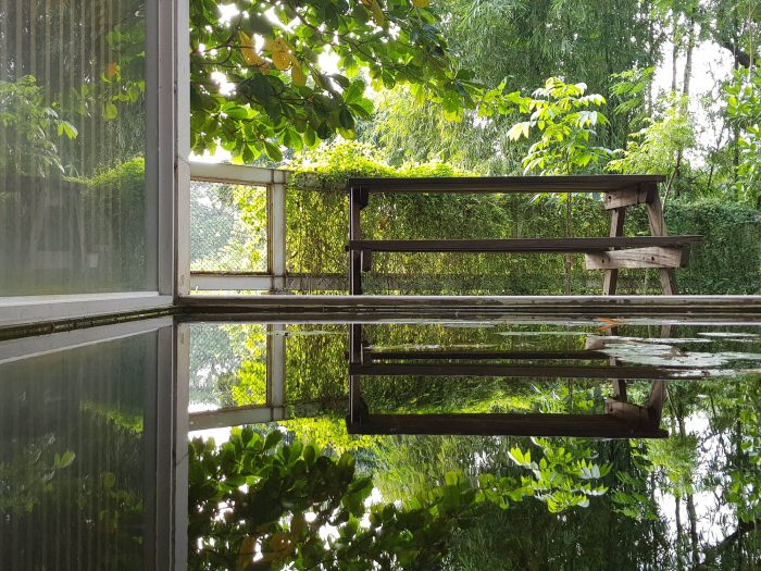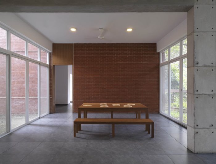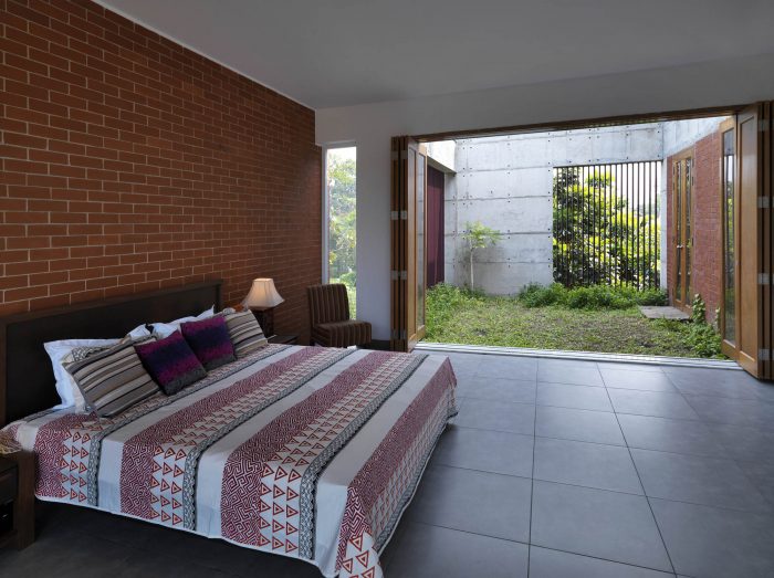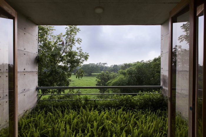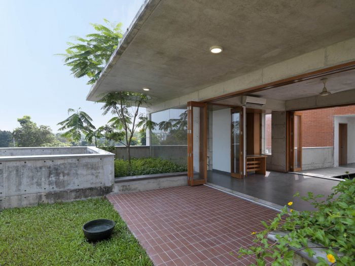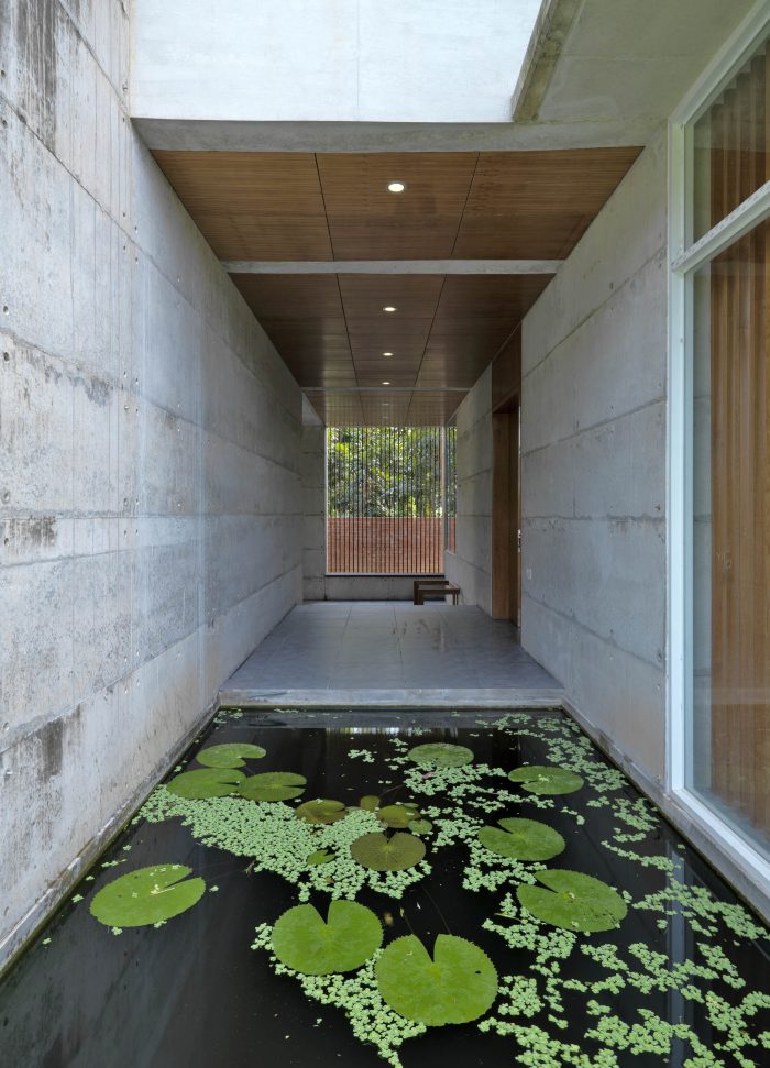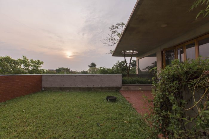 The metal net boundary wall with porosity on the west flank visually connects the residence area with the farmland. The bulk of branching trees including the Indian Almond and Albizia Saman provide a canopy of shade and screening. The landscape seems to be alive with colors with its dramatic ever-changing hues and fragrance. It indeed is a luxury to indulge in the setup of nature from the picturesque frames of the residence.