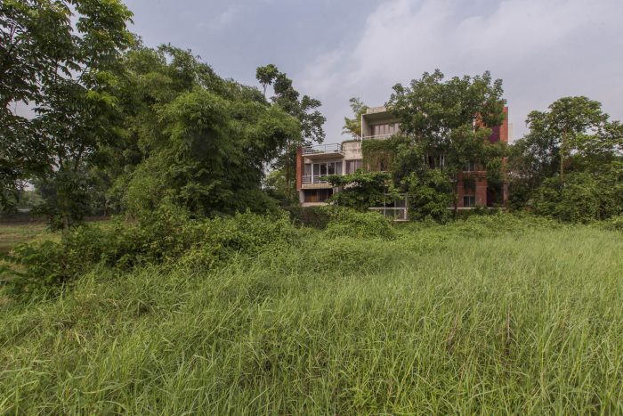 The entry has an initial plinth (dawa) area inspired from the traditional village houses of Bangladesh. There is an open tunnel walkway watching over a water body and framing the green expanse merging with the house lawn. The horizon can be seen on the west from this reception area. The ground floor has the formal living and dining. South westerly wind flows into the cross ventilated dining space where the South eastern wind also flows in from the court with a staircase with glass landing. The formal living opens onto a wooden deck on looking a sea of green.