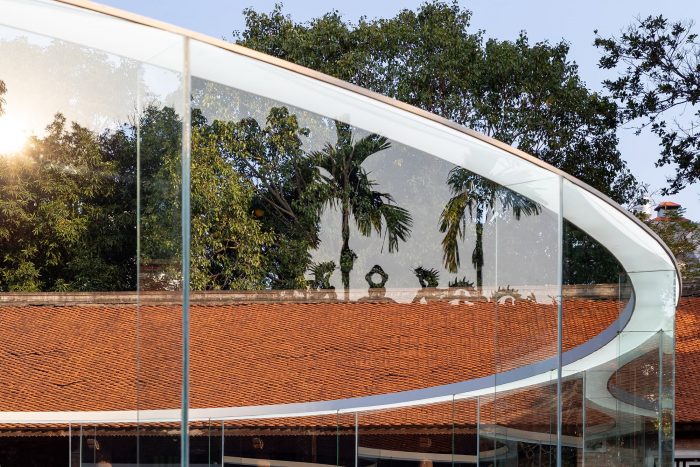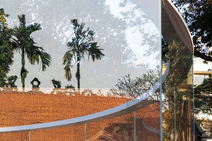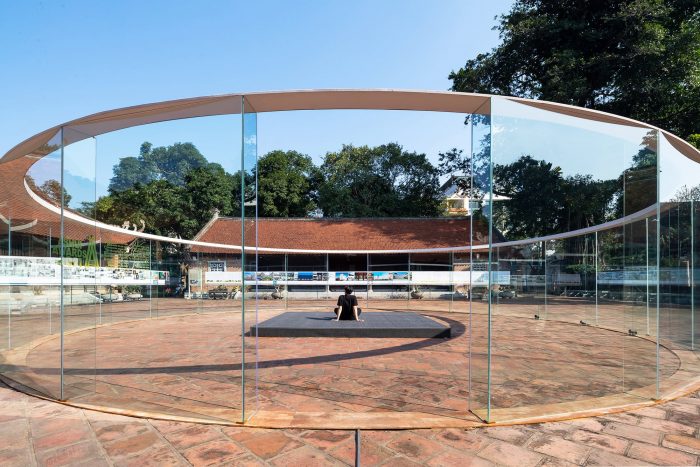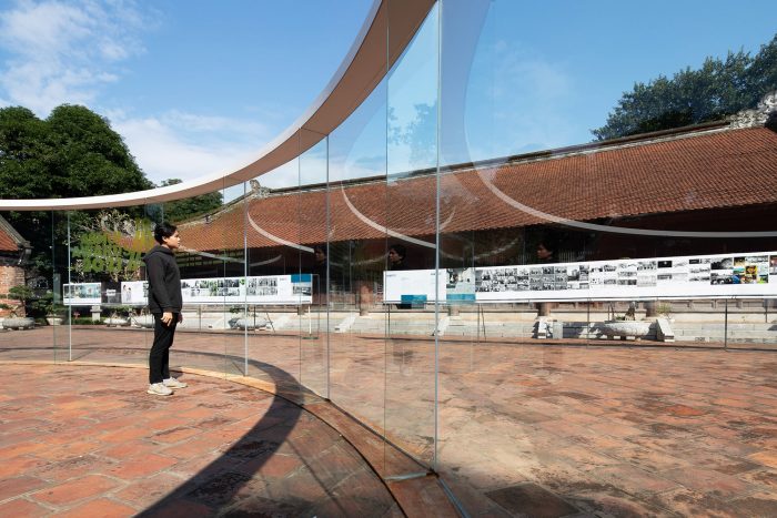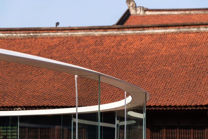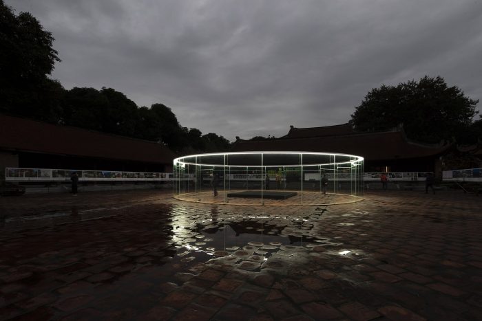 The circle with a diameter of 13m is combined by 20 full-size safety glass panels (1.84m x 2.44m), 2 layers of 8.38mm thick, joined together by 10mm 300mm wide tempered glass panels. This glazing system is mounted on a 10mm thick corten steel plate, with soft joints to adapt to the uneven ground of Thai Hoc House. A white-painted steel rim is placed on the glass pillars, the lower lighting surface is a transparent ceiling with 6000k white LED lights, CRI 90, which has the effect of linking to the top of the flat glass panels. The use of corten steel plate (which is directly oxidized steel, with properties that change with the weather and time, creates the "color of time" as the bearing base, the boundary of the ground, and the glass circle with the concept of the transition between the values of the tradition to the future.
