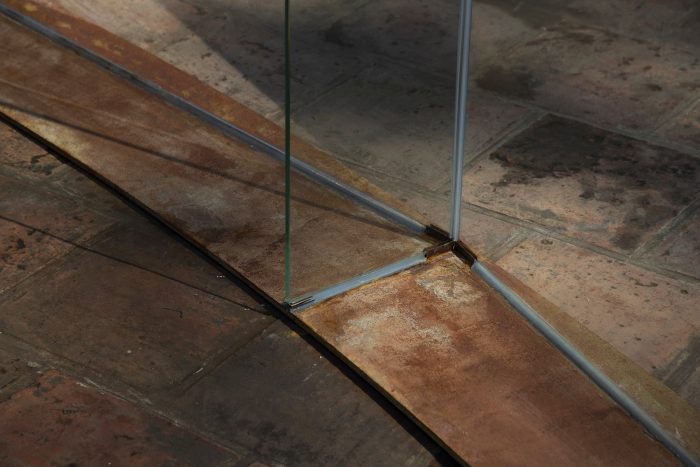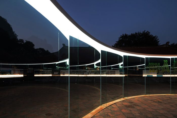 直径13米的圆圈由20块全尺寸安全玻璃板(1.84米×2.44米)组合而成,2层8.38毫米厚,由10毫米300毫米宽的钢化玻璃板连接起来。这个玻璃系统被安装在10毫米厚的皮质钢板上,采用软连接,以适应泰和楼的不平整地面。在玻璃柱上放置了一个涂白的钢圈,下面的照明面是一个透明的天花板,上面有6000k的白色LED灯,CRI为90,有连接到平板玻璃板上面的效果。使用考登钢板(这是一种直接氧化的钢材,具有随天气和时间变化的特性,创造了 "时间的颜色 "作为承载基础,地面的边界,玻璃圈的概念是传统的价值向未来的过渡。