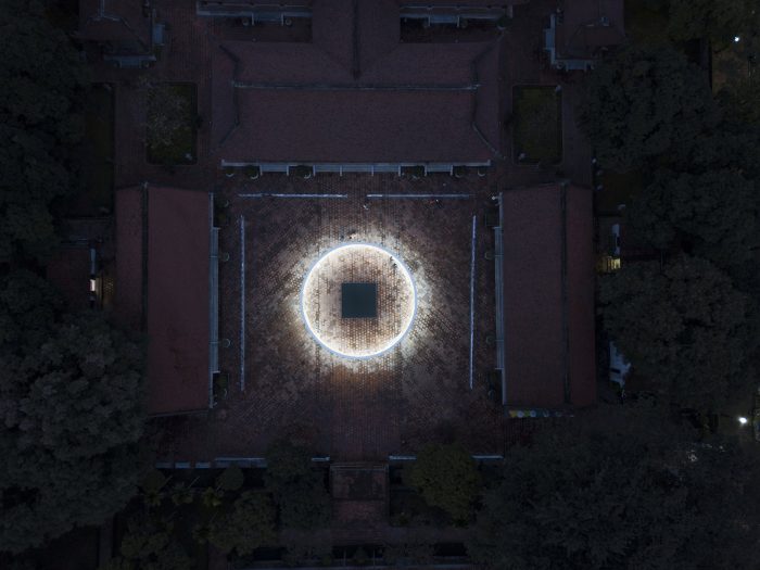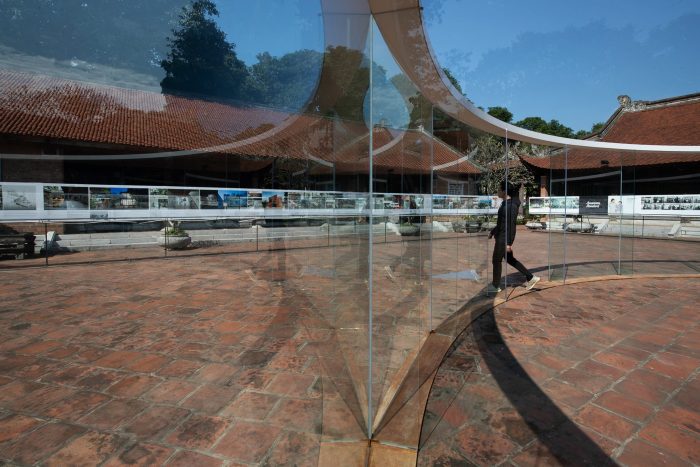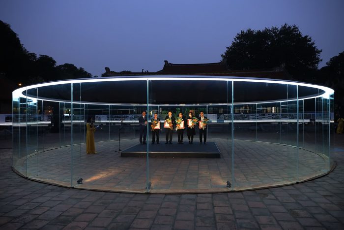 The circle stage is structured by transparent glass panels, which are placed in the center of the yard, in front of the Thai Hoc house. There are 2 entrances to the square stage area in the middle. The awardees and recipients are on the podium. Spatial layout with the concept of harmony between Heaven, Human, and Earth in the theory of the Tam Tai (Heaven, Earth, and Human) of Eastern philosophy. On top of the glass wall, the circle illuminates the entire stage area. The surrounding space is reflected in the circle as the background for the stage and allows visitors to interact directly, working as installation art. In addition, the event was held when the Covid epidemic was breaking out all over the world and in Vietnam. So, the circle and the glass wall are the symbols of social division in the Covid area. Public space has lost its sense of human connection. Thus, this design adapts to the current social context.