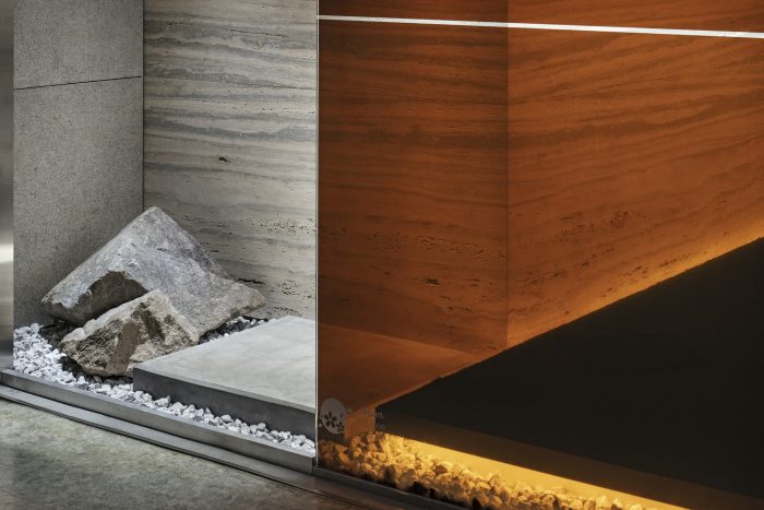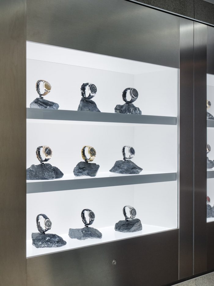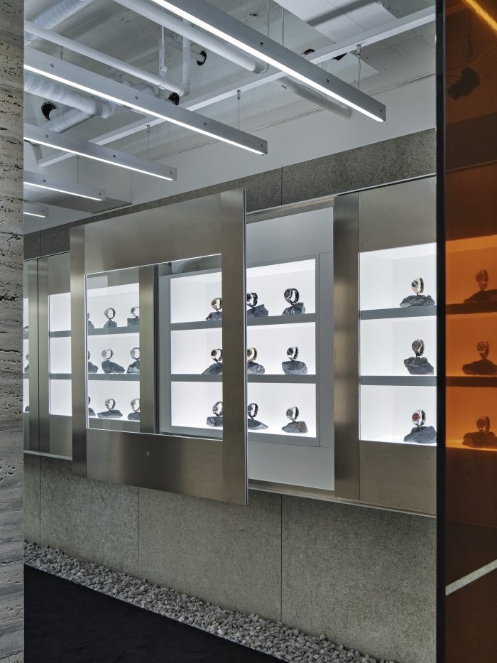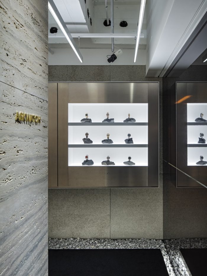 The interior of the store follows the concept of the brand and is designed with high contrasts to create a sense of the relationship between time and space, while also taking advantage of the characteristics of each finishing material, such as stone, plastic, and aluminum, and arranging them in the space. Since it was not possible to create a design incorporating a rough structure on this site, we wanted to visualize the material's unique weight and the accumulation of time by applying stone to some of the walls.