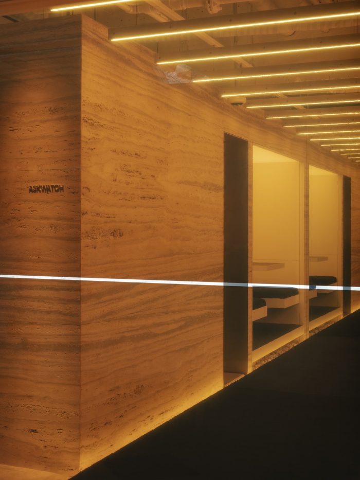 我们注意到,主店的特色照明方案,取消了天花板照明,只用灯具来创造一种不寻常的感觉,这种技术在这个设施中经常出现。因此,有必要将该店与同一建筑中的许多其他商店区分开来,并创造一个能被访问该设施的客户群接受的外墙。因此,我们决定在公共区域和商店内部之间架设彩色玻璃。在遵循无机光的品牌形象的同时,通过彩色玻璃将光线转换为优雅的琥珀色外观,创造出一个优雅的外墙,使该店与同一建筑中的许多其他商店区别开来,吸引其他商店顾客的兴趣。