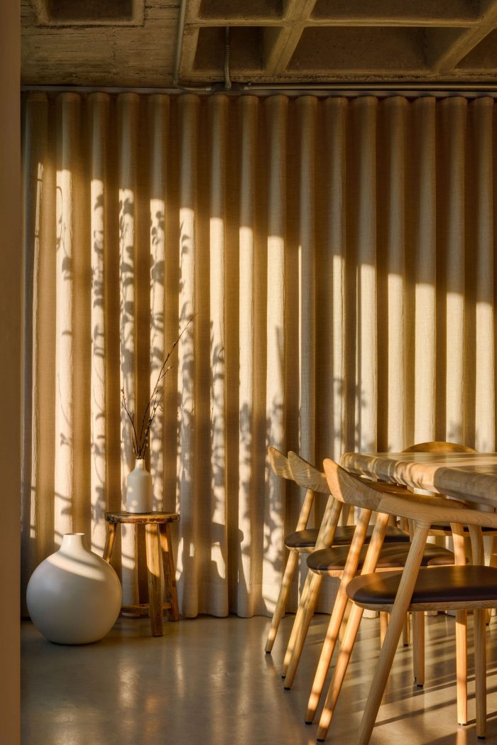 For the finishes, the idea was around natural or essential materials without further treatment and giving that “raw” appearance but elegant and subtle at the same time. Mainly using exposed concrete, wood, glass, and rusty steel. For walls, in the case of the dining room, it was decided to make an unusual decision and to soften the hardness of the other materials such as concrete on the floor and ceiling, and make the space more welcoming, curtains were placed that generate a microenvironment and give the feeling of spaciousness.