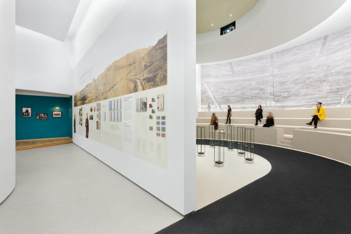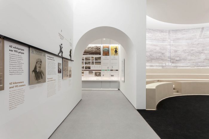Curves and arches were introduced in a new way recalling the ancient stadiums. This has created a fluid organic space that covered the 1800m2 of the exhibition space making the movement of the museum visitors easy and comfortable.