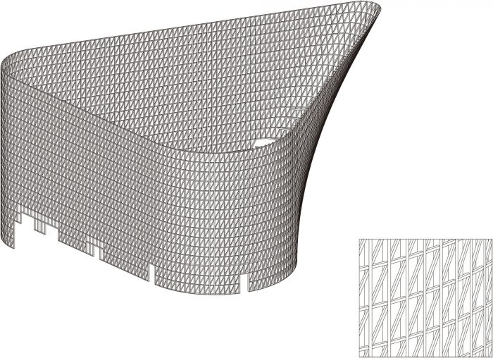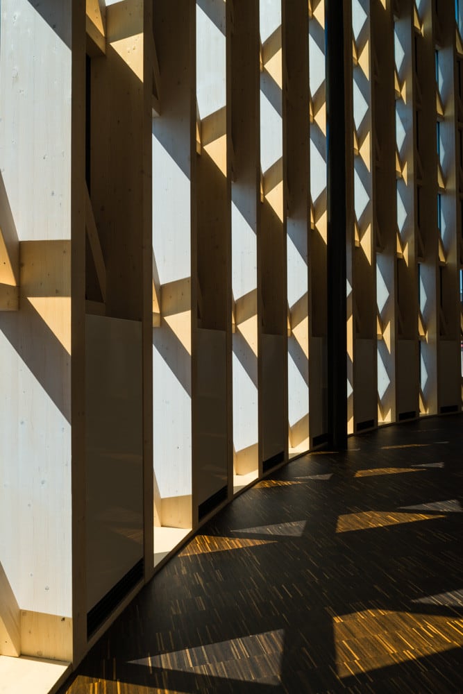 扭曲的立面完全由平坦的玻璃板构成;这种几何形状是由包围整个建筑的三角形图案实现的。不同窗格的变化处理了对隔热、透明以及遮阳的要求,同时又不影响统一的特性。在室内,木制框架与几何形状一样引人注目。为环境提供 "北欧 "氛围的雄心壮志,要求在结构和表面广泛使用杉木。