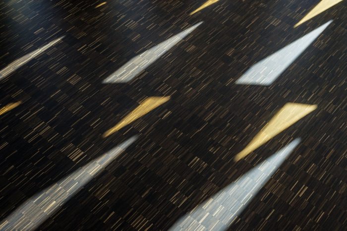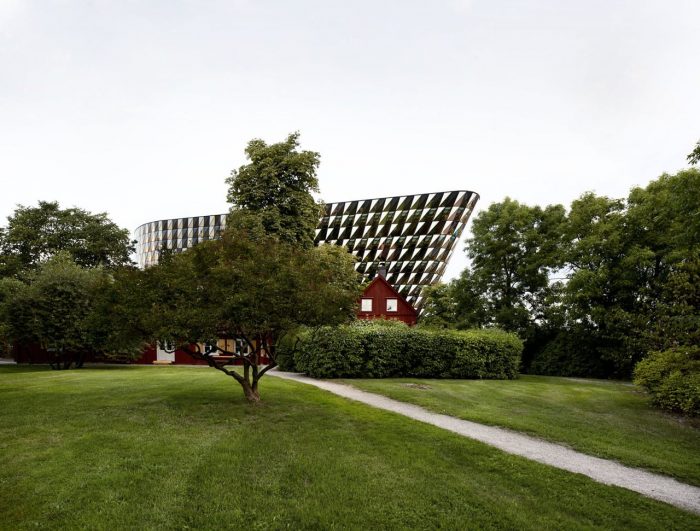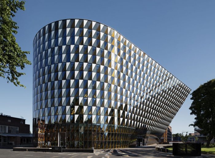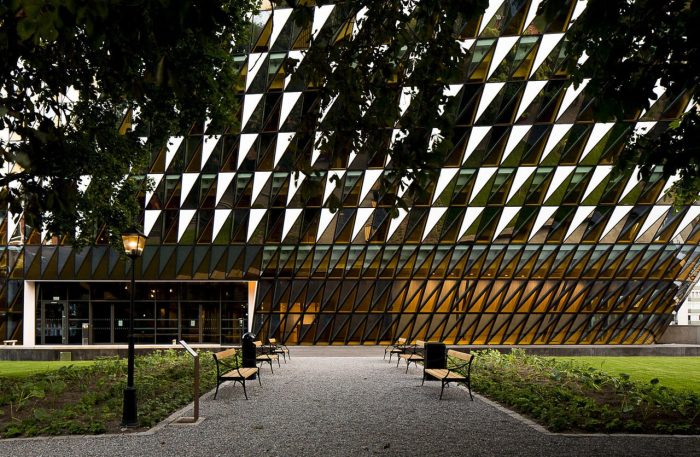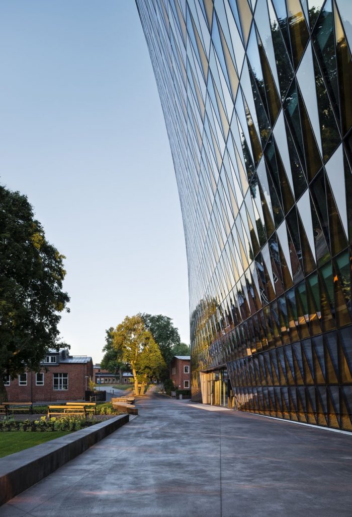 The twisted elevation is made entirely of flat glass panes; a geometry made possible by the triangular pattern that encloses the entire building. A variation of different panes handles the demands for insulation, transparency as well as shade without compromising the uniform character. In the interior, the wooden framework is as striking as the geometry. An ambition to provide a “Nordic” atmosphere to the setting, have called for an extensive use of fir in structures as well as surfaces.
