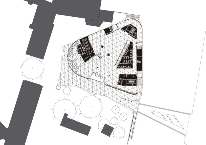 These geometries – the street 5,5 meter below the crossing pedestrian axis and the V-shaped auditorium – denominated the plan. The urban pattern called for a building that treated the street with the same respect as the main entrance toward the walkway. If Solnavägen shall be a street with a human presence in the future, entrances close to the pavement are of crucial importance.