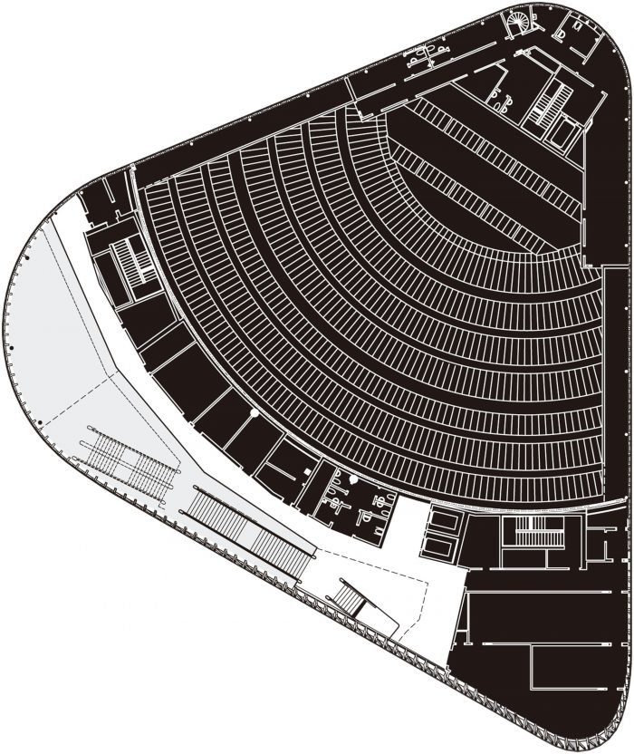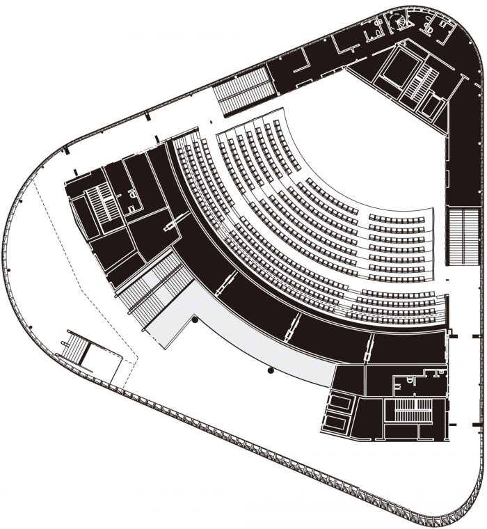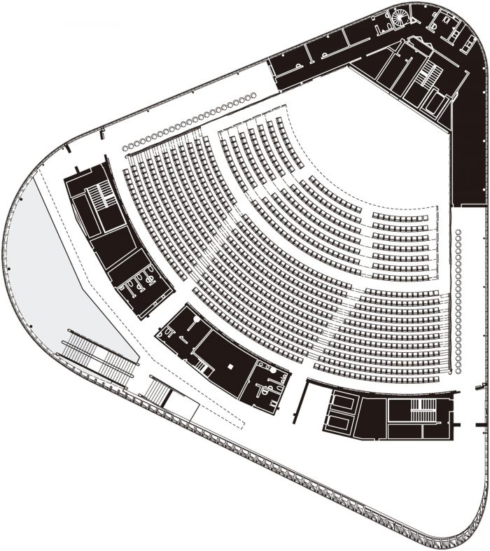 如果与城市的关系是以适应城市模式的愿望为指导,那么建筑的规划就由礼堂产生。对于今天的大礼堂来说,带图像的讲座和舞台上的表演要求每个座位都有良好的视线和声学效果,V形座位被证明是最有效的。它并不总是这样的。大厅的形状已经随着目标的改变而改变。对于KI来说,我们相信,演讲者和听众可以在平等的基础上见面的安排,最能反映当今的学术社会。这也是为什么礼堂入口处的水平与舞台以及可分隔羽绒服的中间部分相等。诺贝尔中心的礼堂应是平等的,但规模和情绪的差异可能需要一个不同的计划。最佳的解决方案从来不是静态的。