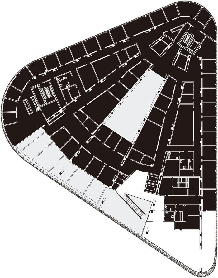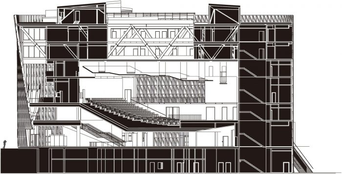 可容纳1000人的礼堂是这座建筑的主宰,同时也是行政管理和教员俱乐部的设施。这些设施位于大厅的顶部,通过大型桁架实现了这一点。整个结构站在三条腿上,在每个角落都有楼梯和电梯。缩进的支撑使室内空间不间断,也使外部形式具有连续性。变化将来自于光线的变化,就像建筑一直以来的情况一样。