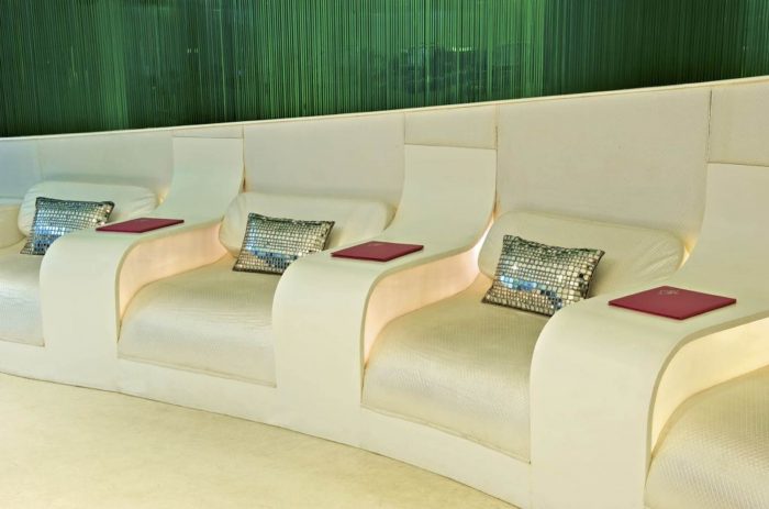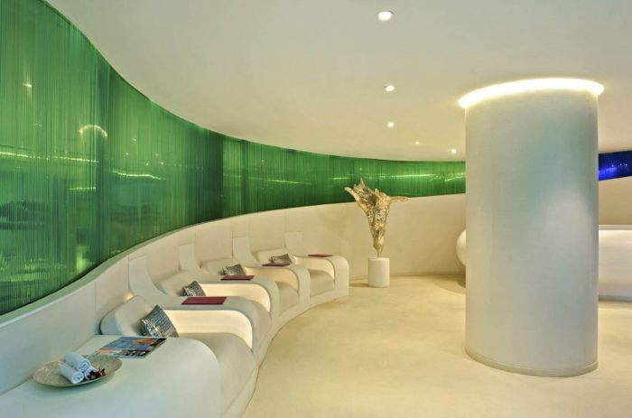 In the circular relaxation area comfortable loungers are divided by sheer white curtains bathed in preprogrammed washes of LED light. Reflecting VIBGYOR colours, the sheer fabric assists in Chromotherapy.