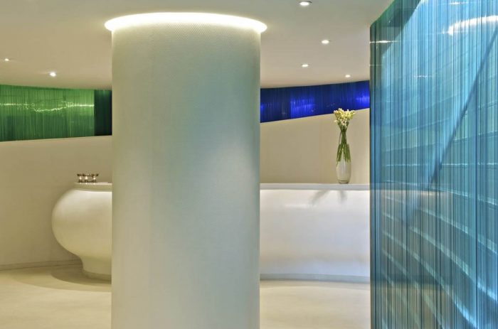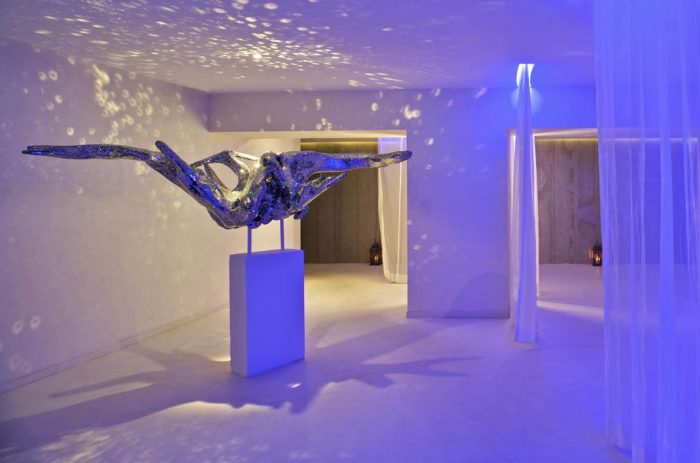 Further west from the reception is a spacious transitionary area leading gently to a sensuous curved relaxation area and a series of well appointed therapy rooms and suites. The minimalist transition areas in the Spa are peppered with carefully chosen pieces of mirrored organic sculpture by French artist Yahel Chirinian. The reflection of spot lights on these mirrored form deflects onto wall, floor and ceiling surfaces giving an etherial feel to the space.