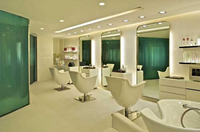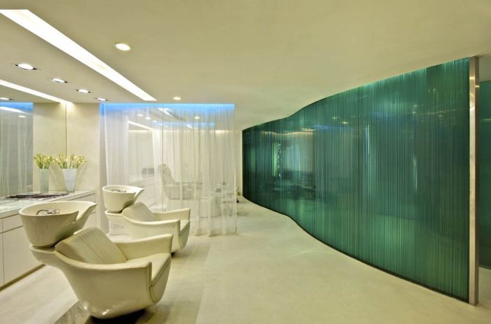 Elements like the Embossed silver foil wall, the eclectic period chairs in the treatment rooms and the padded diamond shaped fabric as uphostery offset the otherwise futurstic interior, subtly echoing Hyderabad’s royal past in a city moving rapidly into the future.