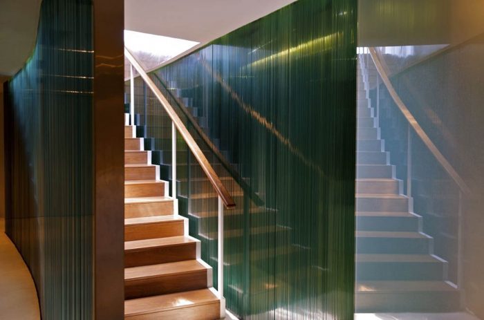 The entrance curved corridor walls of the Spa were built out of edge polished vertically stacked glass, leading to a circular reception area with a fluid reception counter and relaxed customer seating sheathed in moulded white resin. A wooden staircase from the pool level also descends into the central womb like reception zone. The stacked glass walls glow from within with LED light giving the surrounding spaces a feeling of lightness.