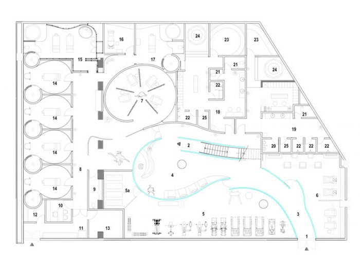 围绕着这个闪亮的中央核心,北面是宽敞的男女湿区,有更衣室设施、更衣室和一个大型按摩浴缸和Lanconium。南面是一个健身房和一个沙龙。