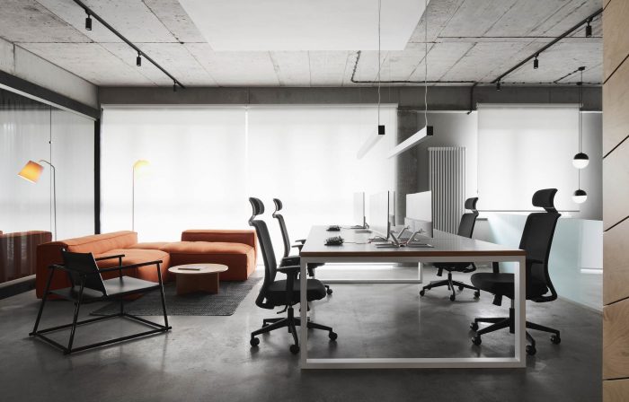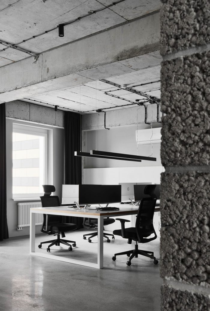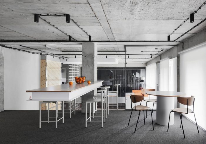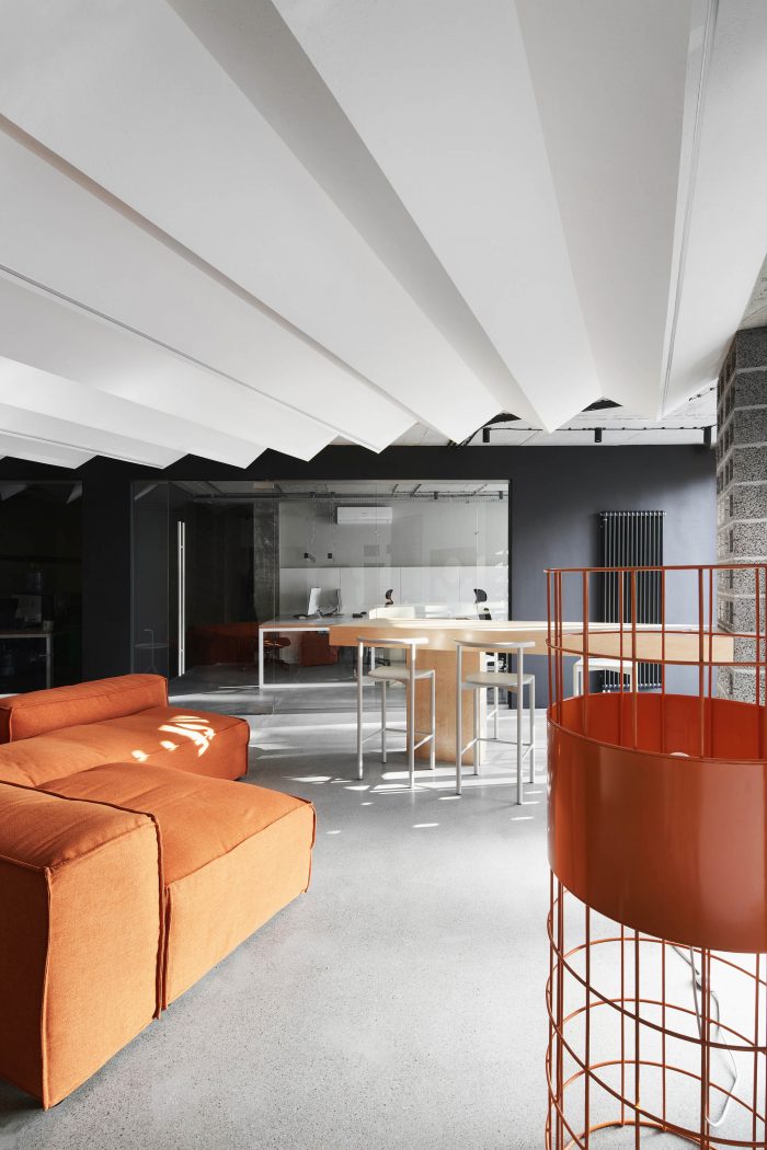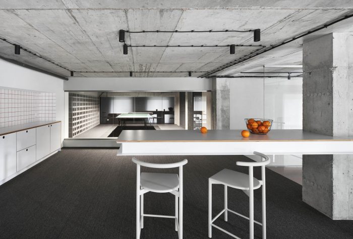 The concept of the office space was developed for a young team of IT specialists united by a common idea and aspirations, which served as the starting point in the development of the interior. A large open and understandable space with monolithic concrete structures preserved in their original form is a kind of basic element, setting a certain entourage and tone for the entire space. And the erected structures and partitions have a specific functional load of delimiting office zones.