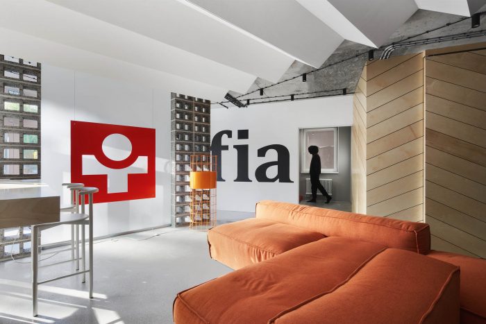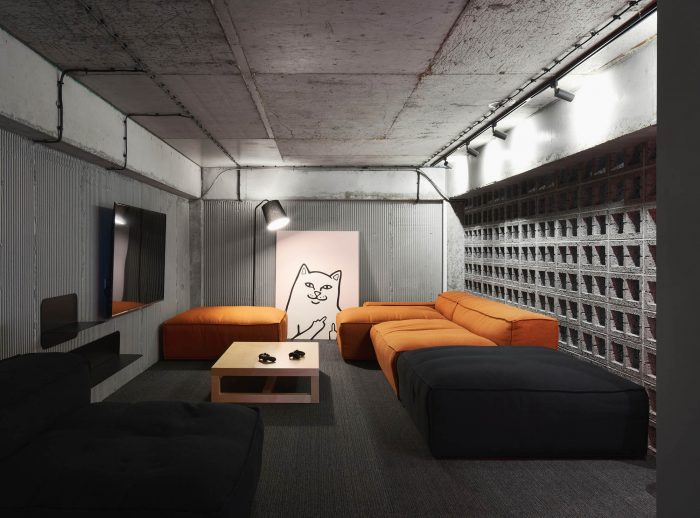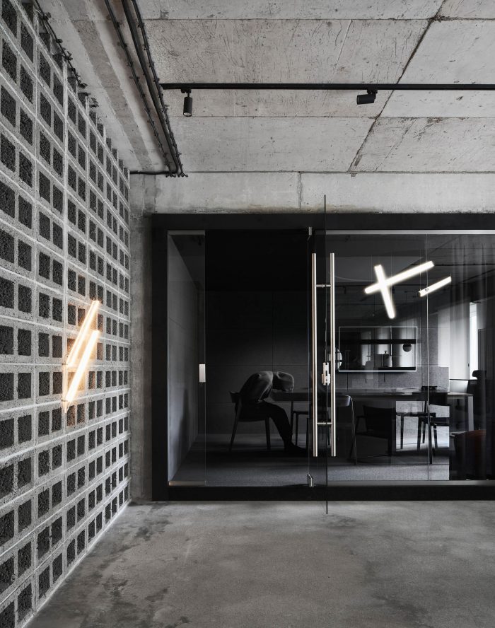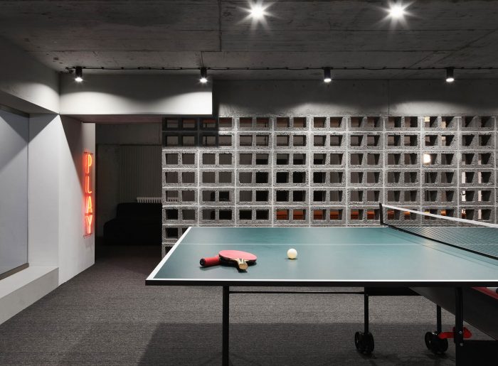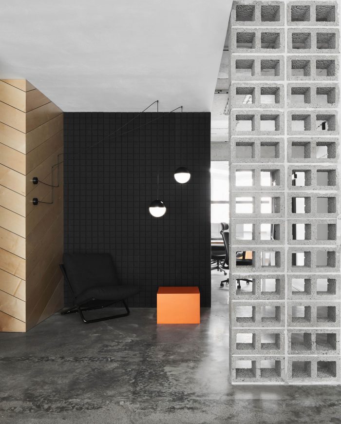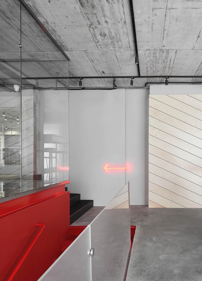 The interior is full of tactile and textured materials - concrete, plywood, combed plaster, as well as cinder blocks, presented in the form of partitions. In addition, there are accent colors in the interior, for example, red acts as a connecting thread between the two floors of the office, and is also the color of the company's identity.