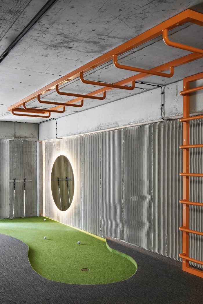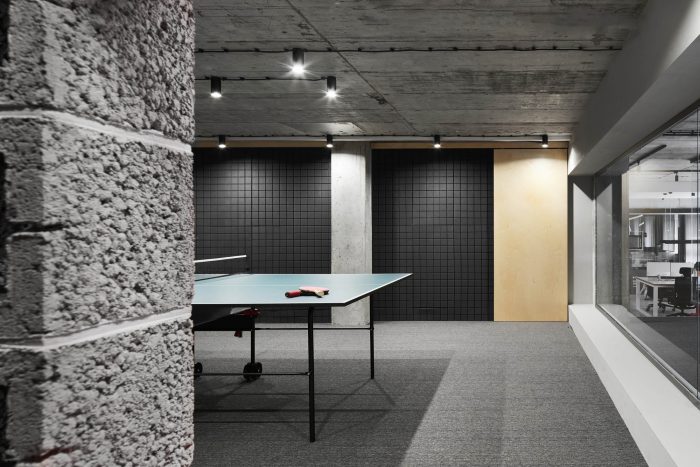 The office has three levels, each with its own specific function with local seating areas. The first level is reserved for the “noisy” departments of the company. The second is an open office space with a prominent black volume of the meeting room area. And the “highlight” of the entire space can be called the recreation area on the third level, where the company's employees can not only dine, but also have fun and active time.