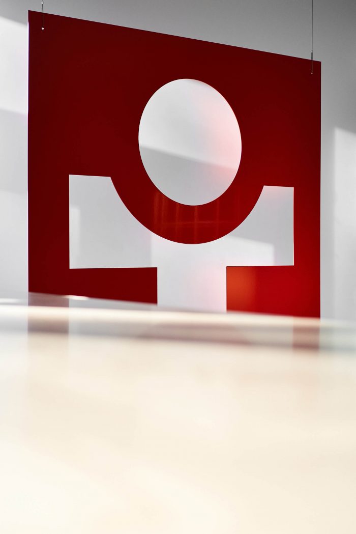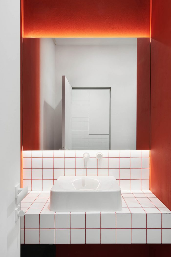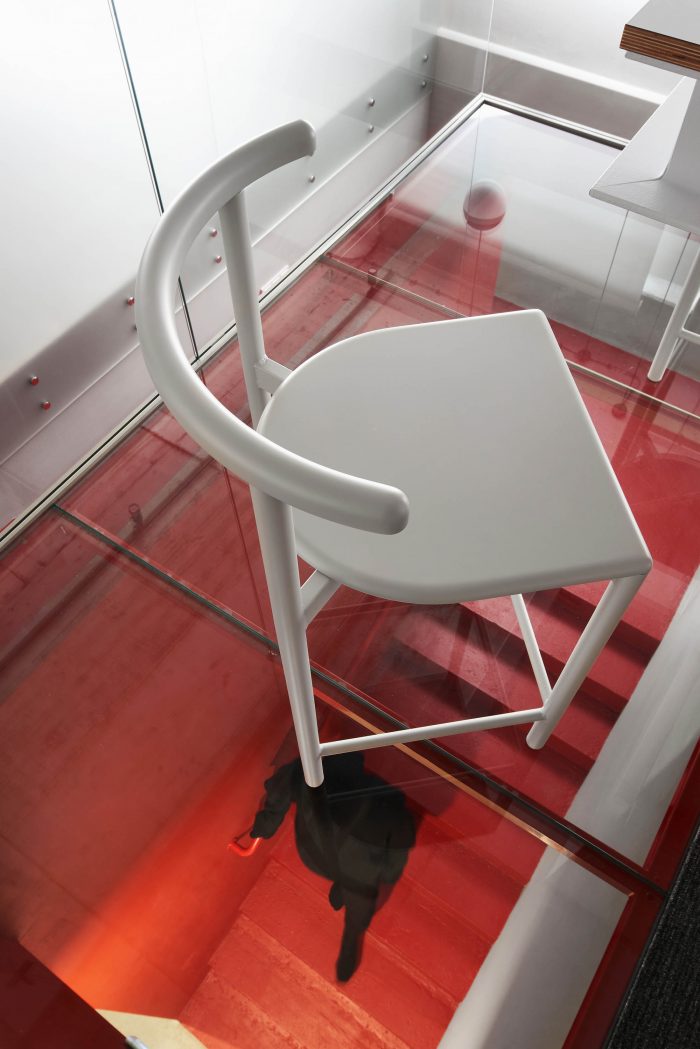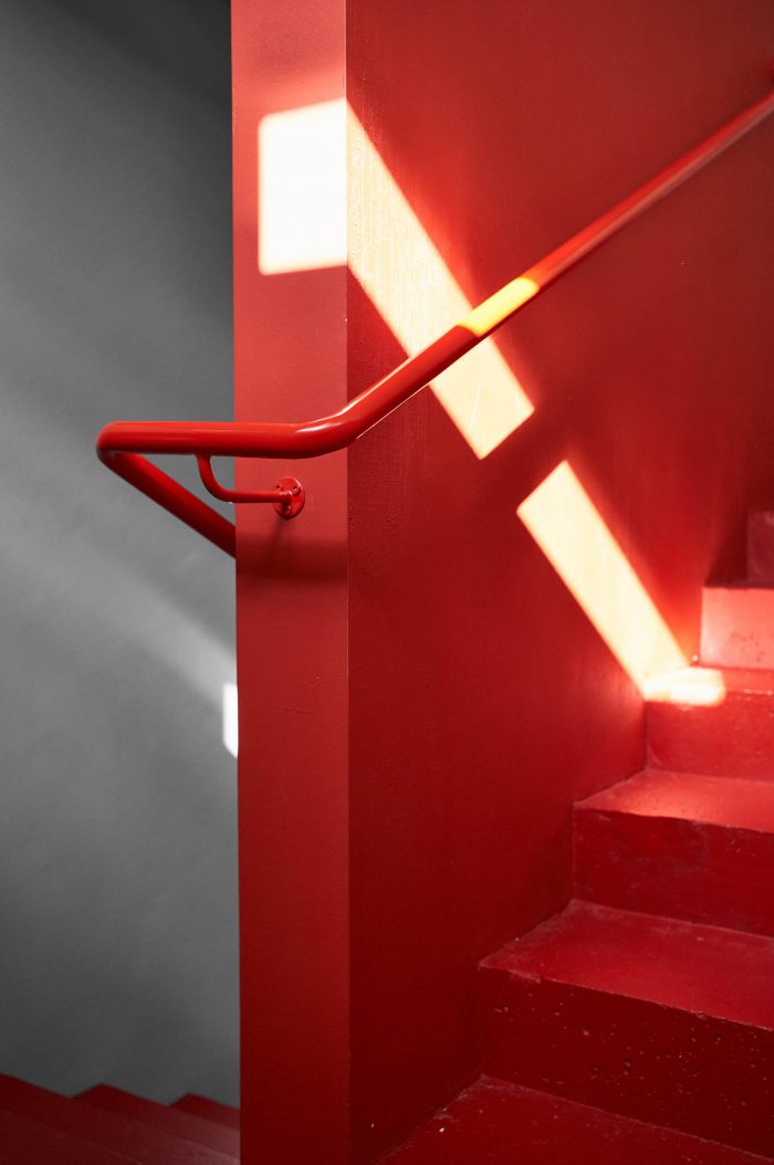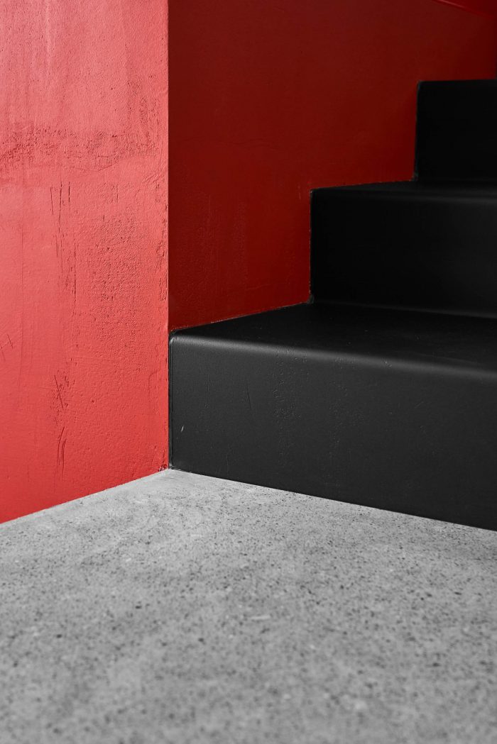 室内充满了触感和质感的材料--混凝土、胶合板、精梳石膏以及煤渣,以隔断的形式呈现。此外,室内还有一些重点颜色,例如,红色作为办公室两层之间的连接线,同时也是公司的标识色。