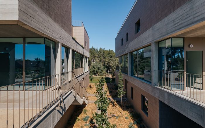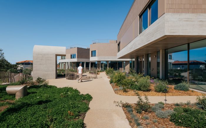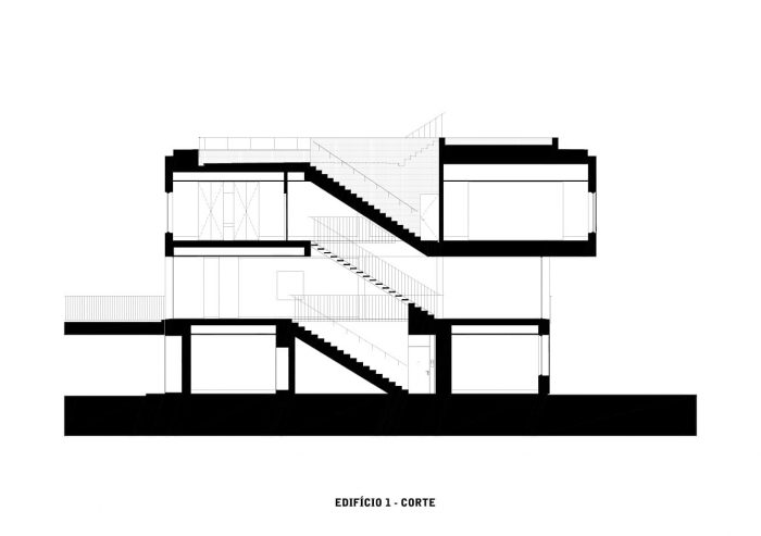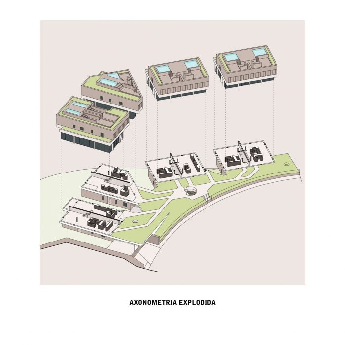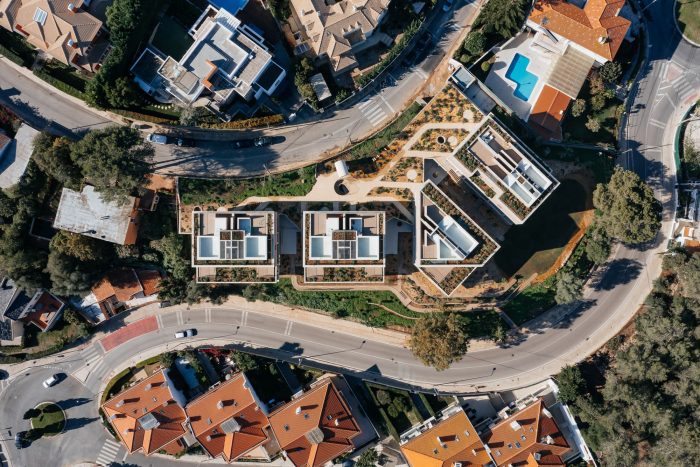 The landscape, designed by the studio Baldios, help to define three distinct areas: to the south, the area corresponding to the garage roof, low vegetation, bushes, and paths solve access to the houses; to the north, a flatter area presents itself with a meadow-like vegetation cover and wooden equipment that invites you to stay; even further to the north, an area with a steep slope receives larger vegetation that attenuates the volumes of the buildings when seen from the street at the lower level. Paths that invite the exploration of the landscape to connect all these areas.