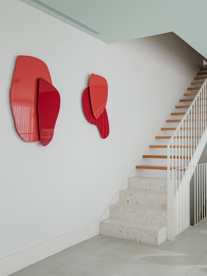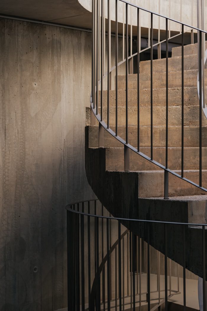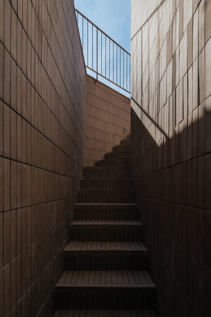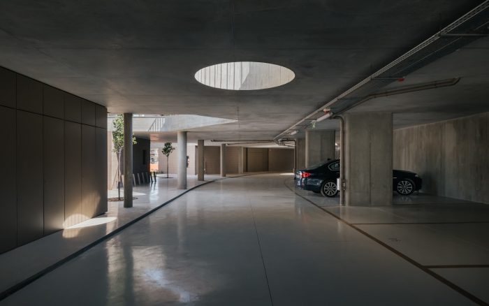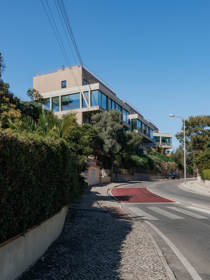 The remaining floors house the bedrooms and are designed in a more reserved way with more contained openings and façade panels covered with handmade brick. On the roof of each house, a terrace and a pool offer a wide view over the bay of Cascais and evoke the hedonistic relationship that this city has with the sea and the summer. Connecting all the volumes is a semi-buried garage that takes advantage of the difference in heights of the site to open to the north and communicate directly with the garden – a house for cars