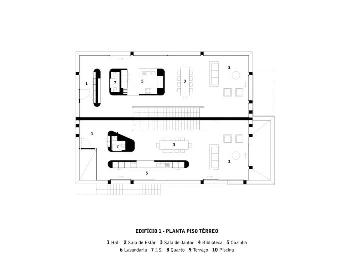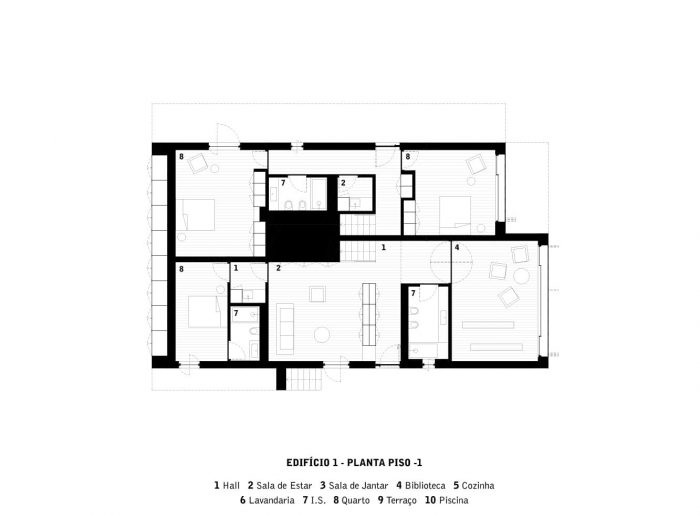 其余的楼层是卧室,设计得更有保留,有更多的开口和覆盖着手工砖的外墙板。在每栋房子的屋顶上,有一个露台和一个游泳池,提供了卡斯卡伊斯海湾的广阔视野,唤起了这个城市与大海和夏天的享乐主义关系。连接所有体量的是一个半埋式车库,利用场地的高度差异,向北开放,并直接与花园沟通--一个汽车的房子。