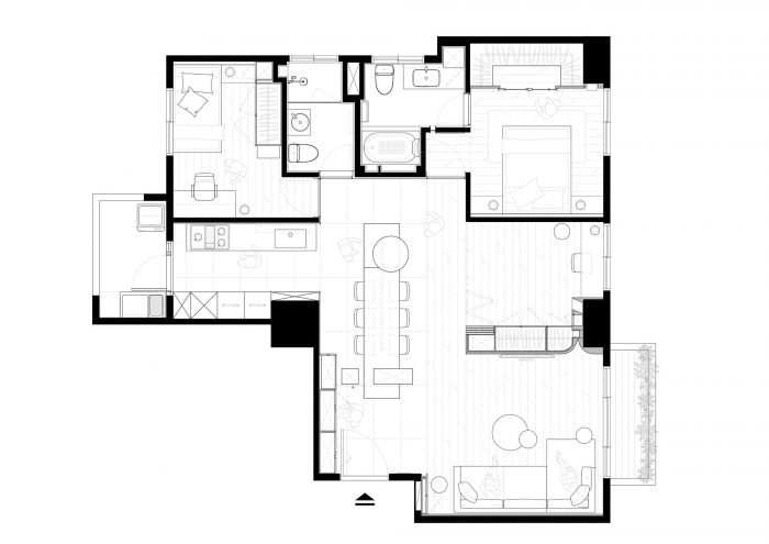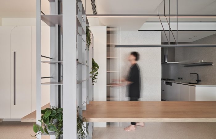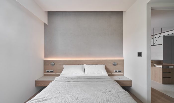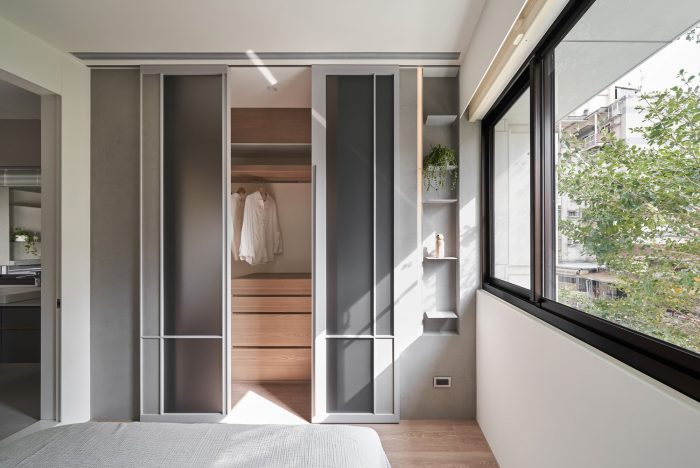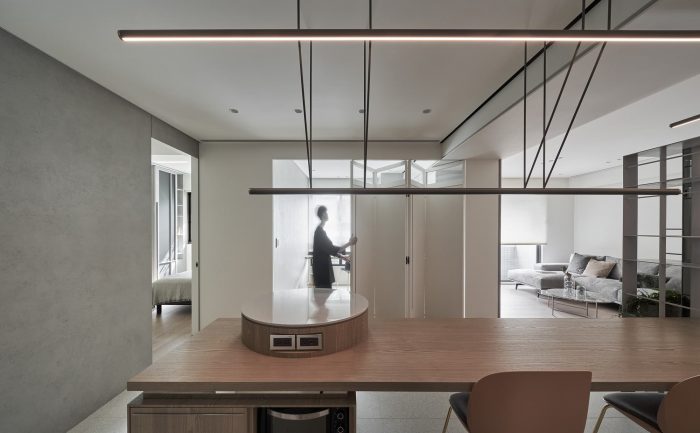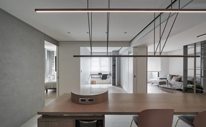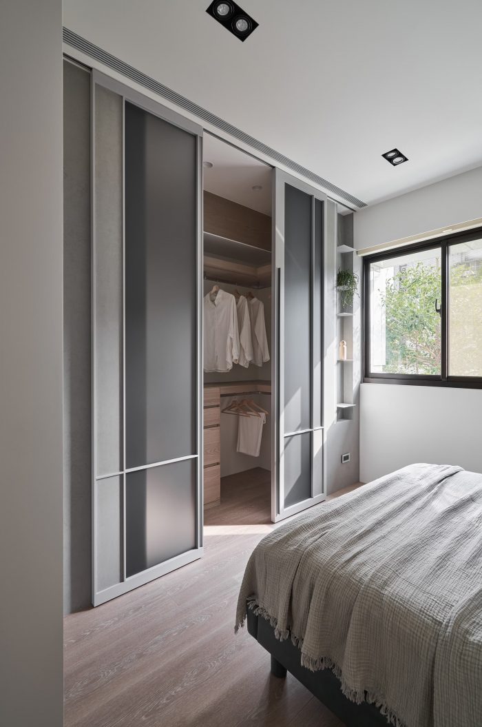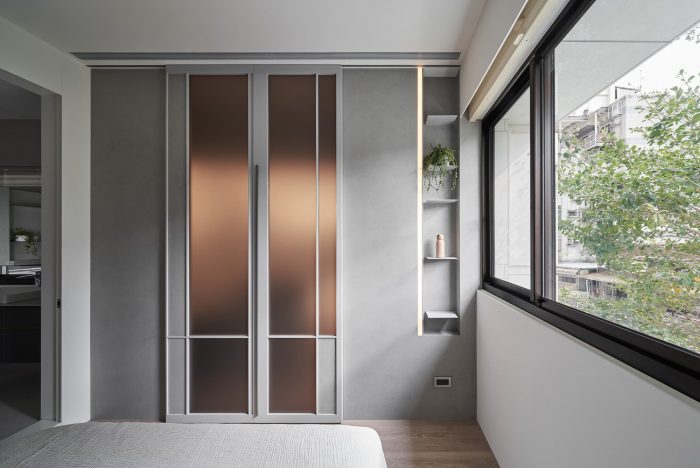 The folding door of the study with windows at top can freely convert the functionality of the compact space, allowing contemporary and soothing colors to lay down the axes of a leisure life.