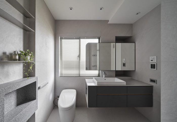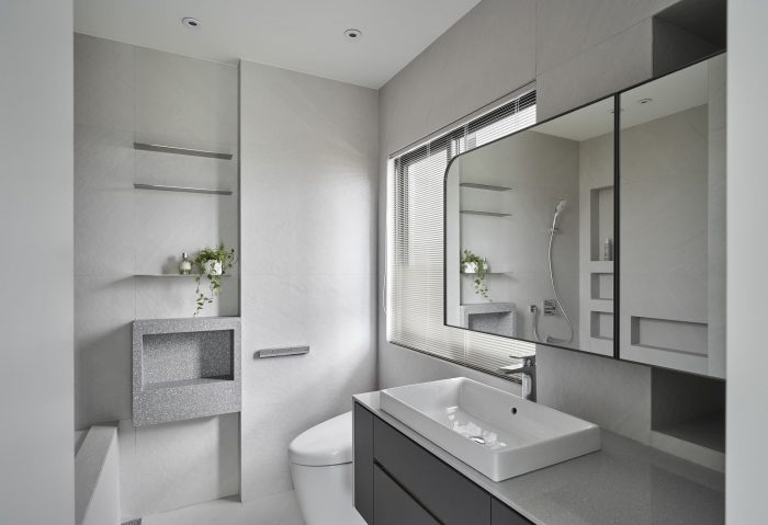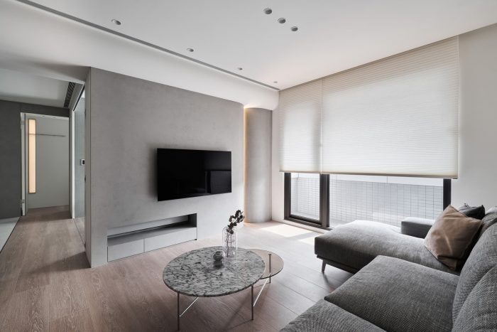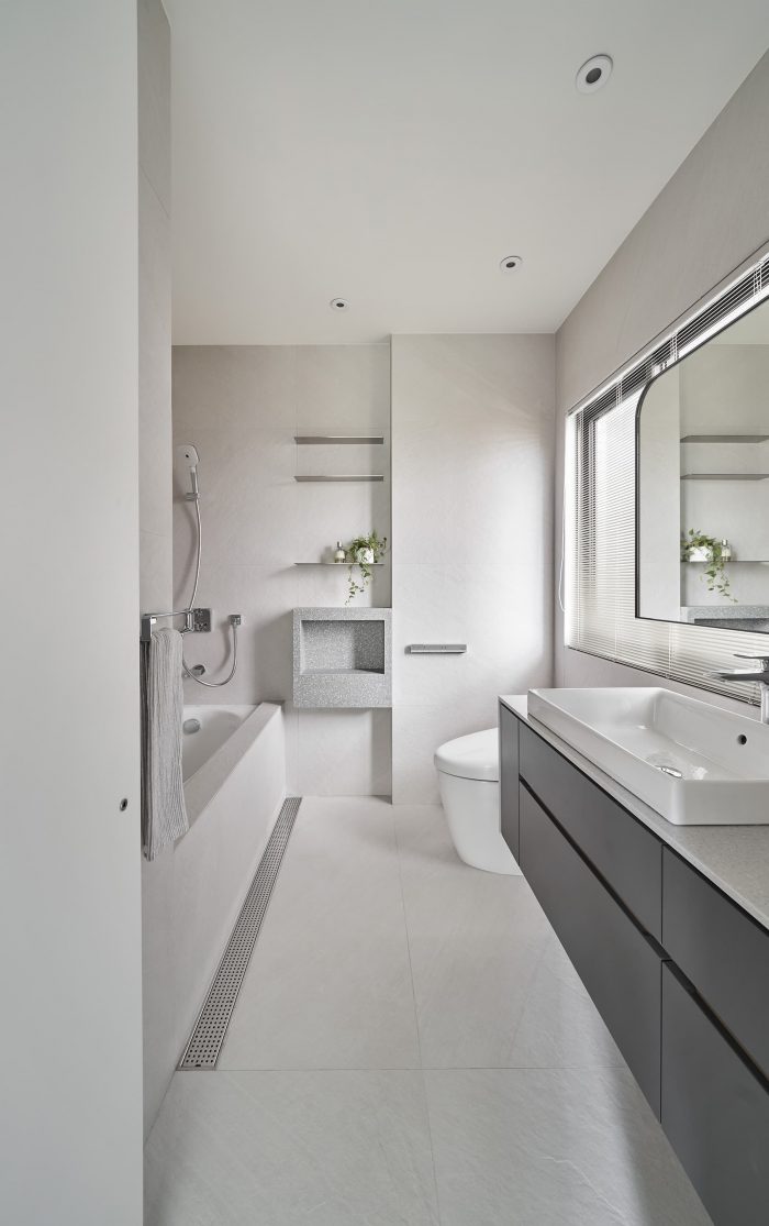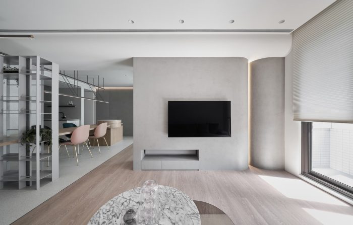 Large white and warm wash stone tiles carry on childhood memory, and the curvature of the humble cement wall creates with light fixtures gentle gradient of light, giving corners in the space rich variations of light and shadow.
