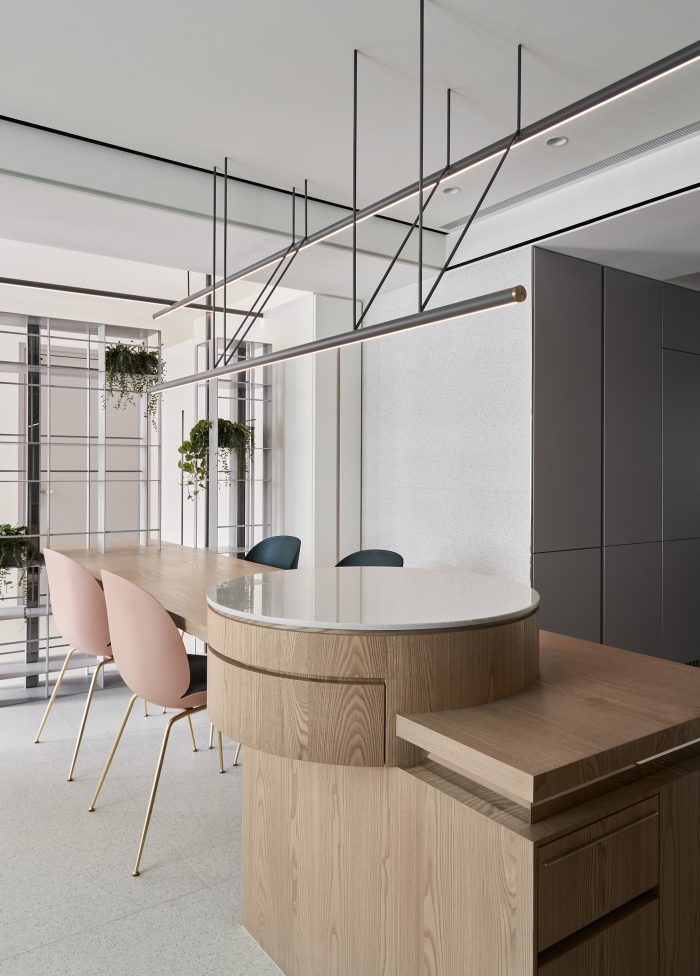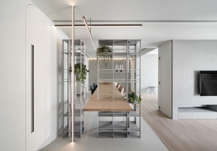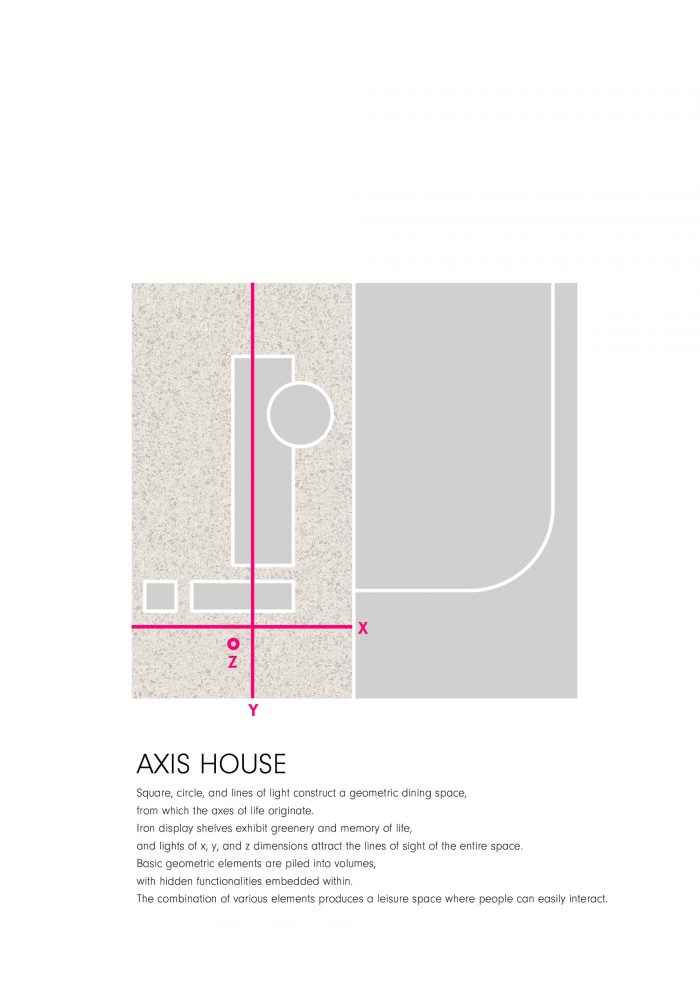 Square, circle, and lines of light construct a geometric dining space, from which the axes of life originate. Iron display shelves exhibit greenery and memory of life, and lights of x, y, and z dimensions attract the lines of sight of the entire space.