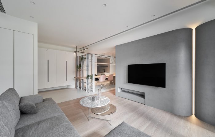 大型的白色和温暖的水洗石砖传承了童年的记忆,简陋的水泥墙的弧度与灯具创造了温和的光线梯度,使空间的角落有丰富的光影变化。