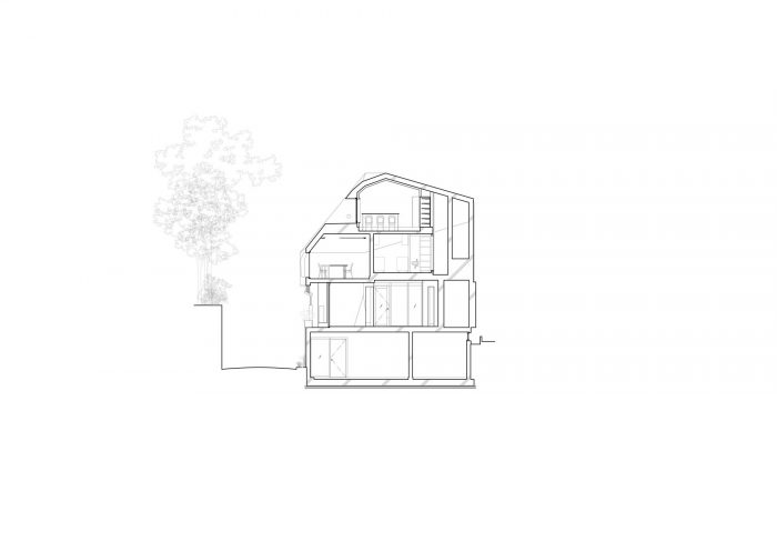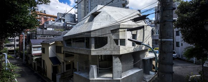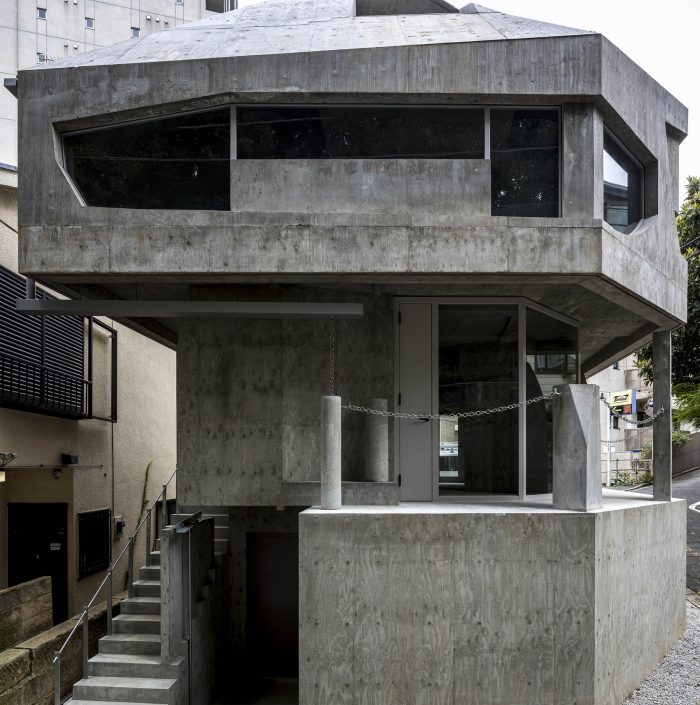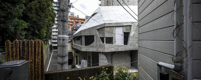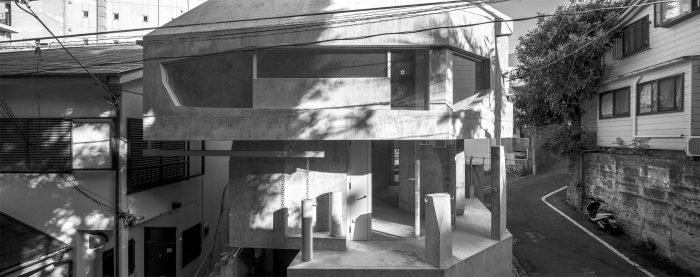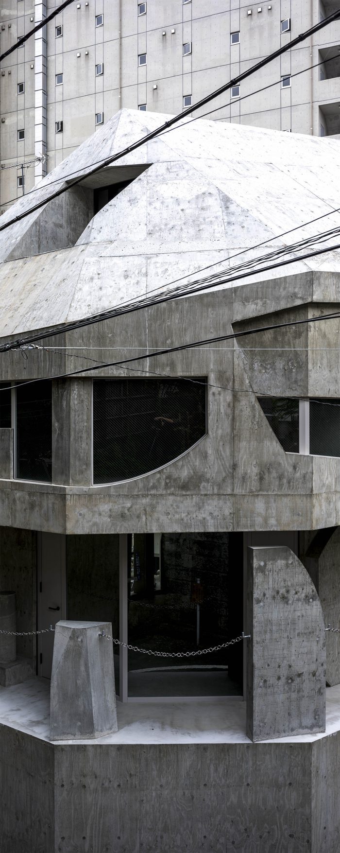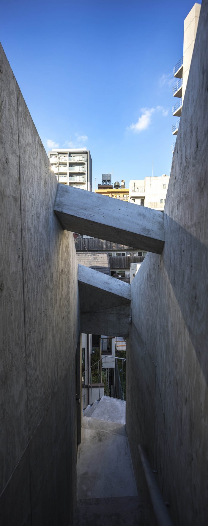 A tenant building planned in Azabu-juban. Azabu-juban is located on complex terrain interwoven with plateaus and valleys, and the site is surrounded by steep slopes and retaining walls. For instance, the neighboring Kurayamizaka (Dark Slope) is said to have been so named for the trees that were dense enough to cover the slope, making it dim even in the daytime. From the top of the retaining wall facing the site, the trees in the neighboring yard cast dark shadows on the building. There are also legends, called the Seven Wonders of Azabu, which are about the ponds, swamps, and oddly shaped trees in the area. The topographical singularities of the land once gave birth to stories, but they are no longer handed down and have been forgotten as memories of a distant land. When something once familiar but forgotten and estranged over a long time appears before us, we feel an “eerie” sensation.