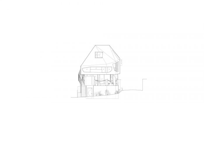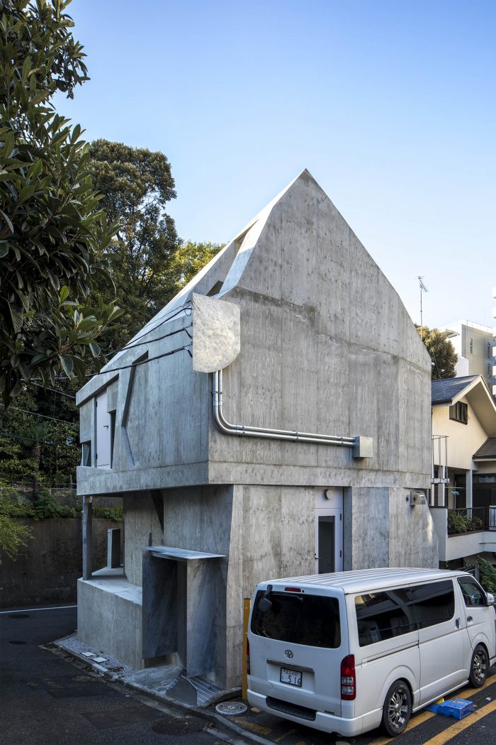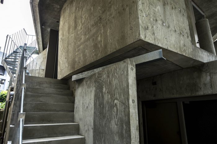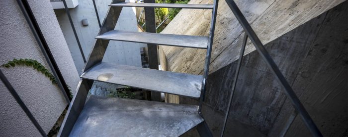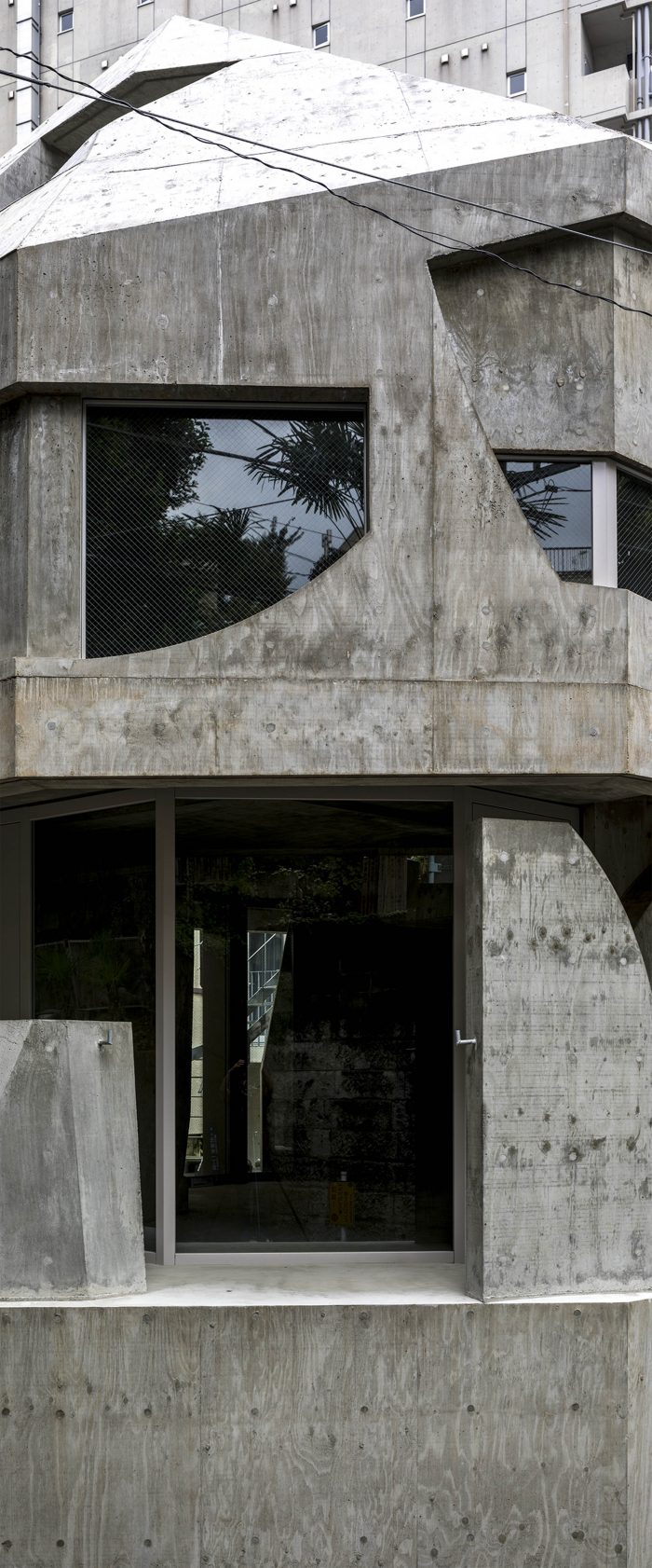 The resulting architecture evokes terrain that has been partially uplifted by the metamorphic action of the earth’s crust. In addition to the forms of the openings in the building body, and the stairs, handrails, rain gutters, and plumbing attached to the building, there are many solids both inside and outside that do not allow easy exploration of the design basis, such as lighting fixtures that seem to have been improvised, lumps of concrete that stand on their own like stone plates, and walls chipped in unshapely fashion. The seemingly groundless language of form makes even the slab steps and beam forms look like useless objects that deviate from the rationale of the structure.