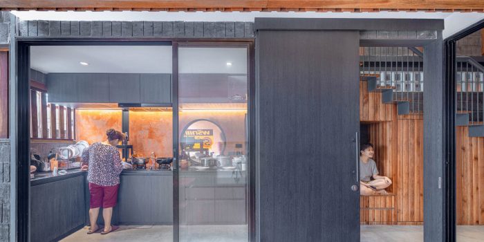 Limitations were put as the main factor in design planning. Including the constraints of surround view and ventilation. The designer brought these limitations to break the familiarity of home-made design, function in front of the house as a welcome zone, and place a Thai kitchen behind the house. On the other hand, this building uses the Thai kitchen to welcome guests at the front of the house and place the dining zone in the next section. Because of the road in front of the house is the best airflow area. In the future may add more food business from homemade curry products since the owner's mom likes cooking. The Thai kitchen is the backbone of the house, connecting the area of the house and curry paste factory. It also helps to support the cafe's coffee bar, another family business that will occur in the future.