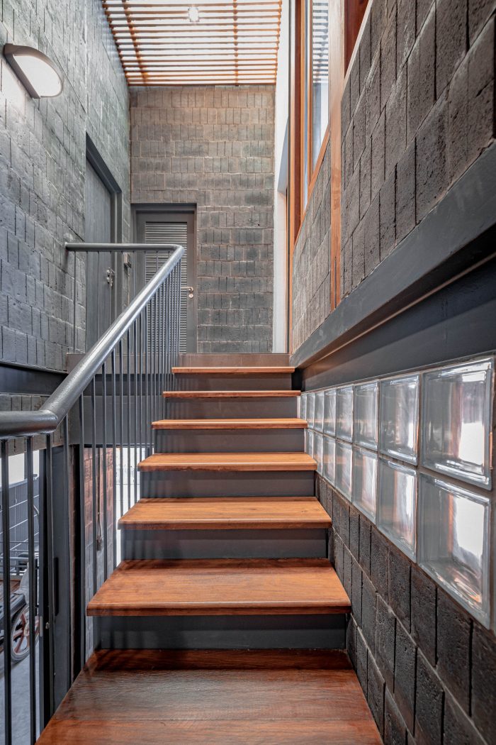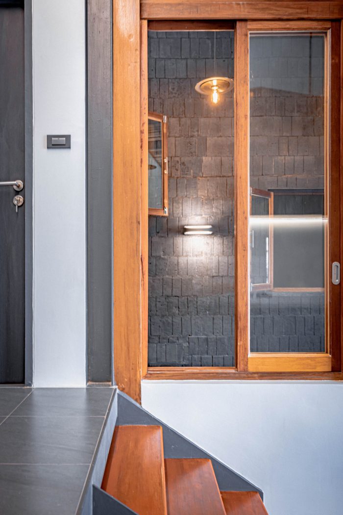 The area of the stairs was used to divide the building. It was designed as an open space up to the second floor and opened the roof to allow the natural light to descend into the center of the building. It makes the house get enough light and save energy. Below the stairs has been converted into a living and storage area. Above the staircase, there are windows for 2 bedrooms. Including the living room that connects the view of the home. Moreover, the natural light is distributed in the staircases in the middle of the house to cover the various area thoroughly.