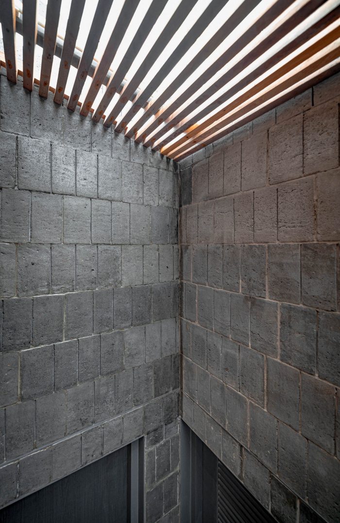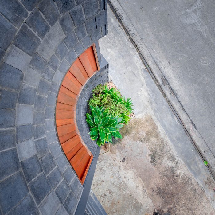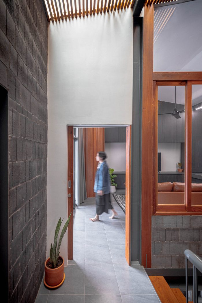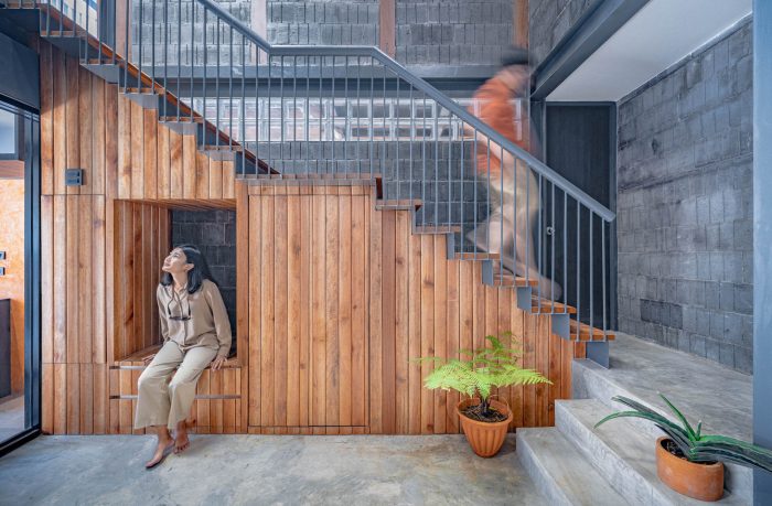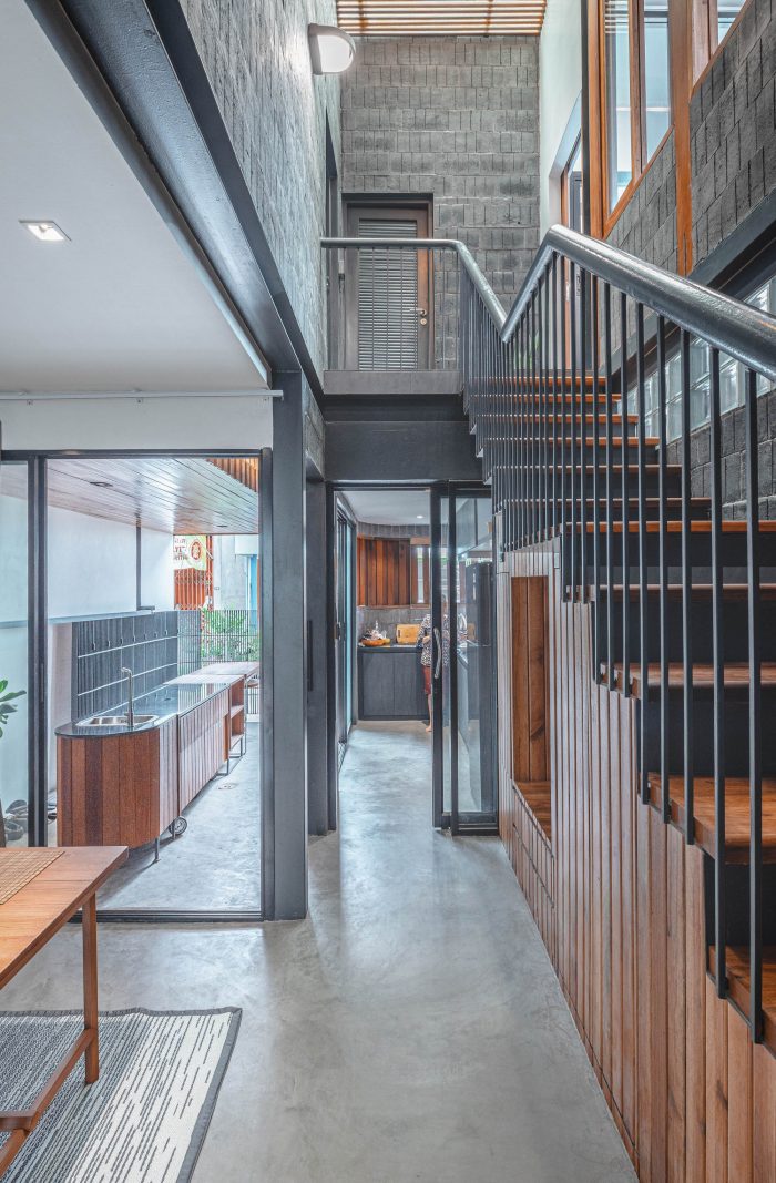 楼梯的区域被用来划分建筑。它被设计成一个开放的空间,直到二楼,并打开屋顶,让自然光下降到建筑的中心。它使房子得到足够的光线并节省能源。楼梯下面已经被改造成了一个生活和储藏区。楼梯上方,有2个卧室的窗户。包括连接住宅景观的客厅。此外,自然光分布在房子中间的楼梯上,彻底覆盖各个区域。