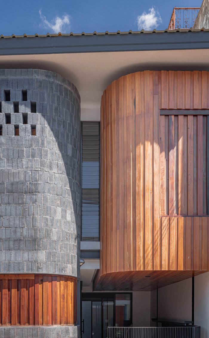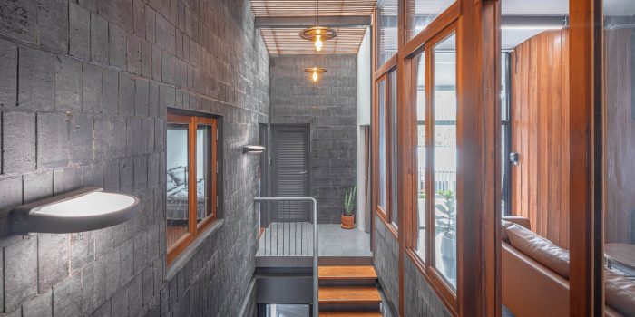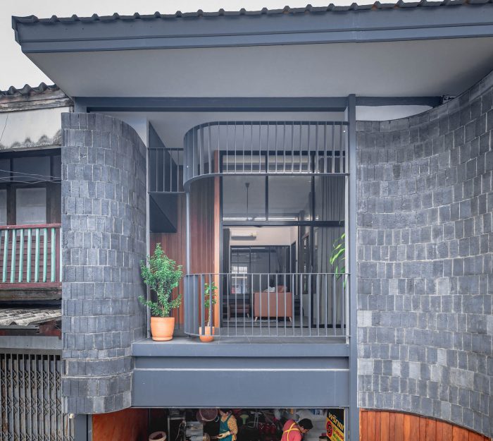 The facade still maintains the identity of the front porch on the second floor of this community. In the past, the balcony was the area that linked each home. The living room is placed next to the balcony to let the air and natural light access easily.