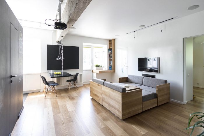 We decided to design the living room in such a way so that the space could be organized differently depending on the mood and occupations. This objective is perfectly met by mobile furniture. It includes 7 modules on the wheels: 4 armchairs, two poufs and a coffee table. They are easy to move and can be assembled in various combinations: family movie watching, table games, sitting with the guests, etc.