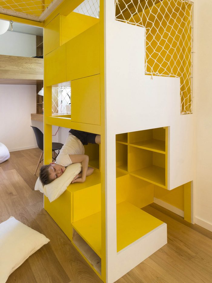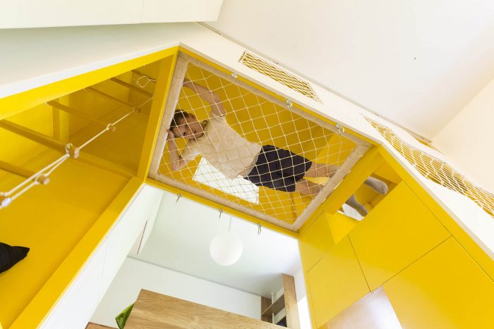 A room of 16 sqm was allocated for the children's area. The room is divided into two parts by the central playing set, which includes several levels for climbing, a hammock and small houses with windows. On both sides of the playing set there are sleeping accommodations and a table for study.