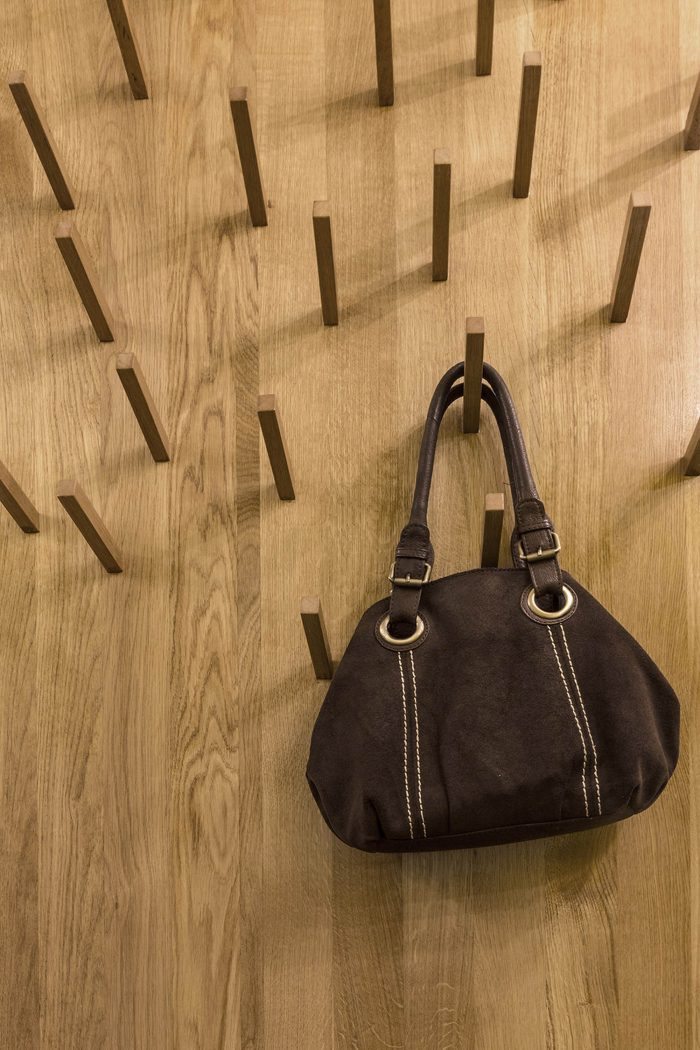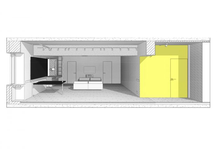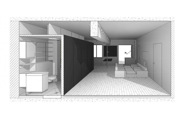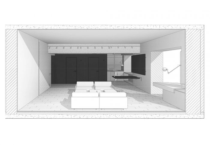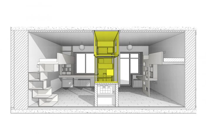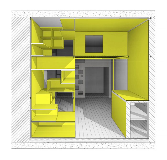 位于公寓入口处左侧的黑色立方体包括一个衣帽间和鞋柜,一个浴室,一个独立的水柜,以及厨房区域一侧的内置橱柜和一个冰箱。储物柜位于入口处,可以通过一个便携式梯子到达。这个立方体用石板黑漆覆盖,成为吸引孩子们的中心,因为他们很喜欢有机会在墙上尽情地画。对面的墙壁上覆盖着马克笔漆。这也是孩子们创造力的一个大场面!