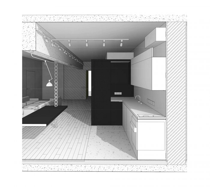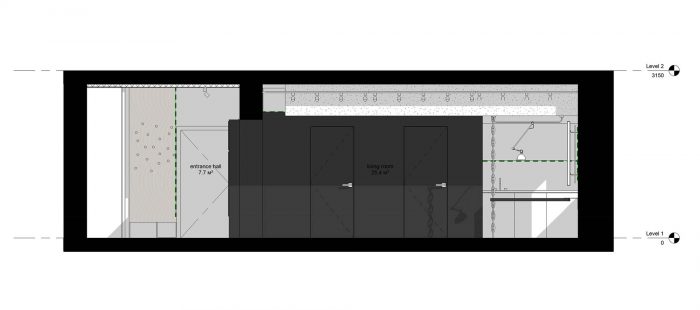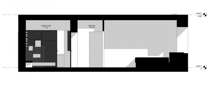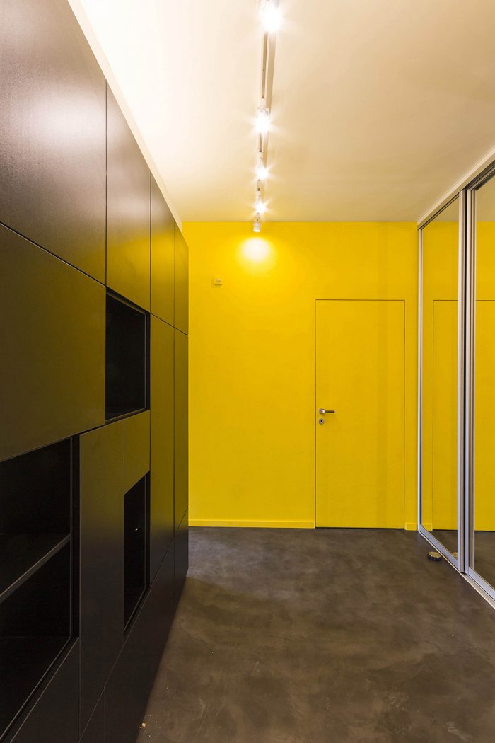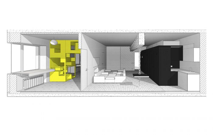 The black cube located to the left from the entrance to the apartment includes a coat and shoes closet, a bathroom, a separte water closet, as well as built-in-cupboards and a fridge from the kitchen area side. The storage cabinets are located at the entresol which could be reached via a portable ladder. The cube is covered with slate black paint and became a center of attraction for children, as they appreciated an opportunity of drawing on the walls as much as they please! The opposite wall is covered with marker paint. This is also a large field for children's creativity!