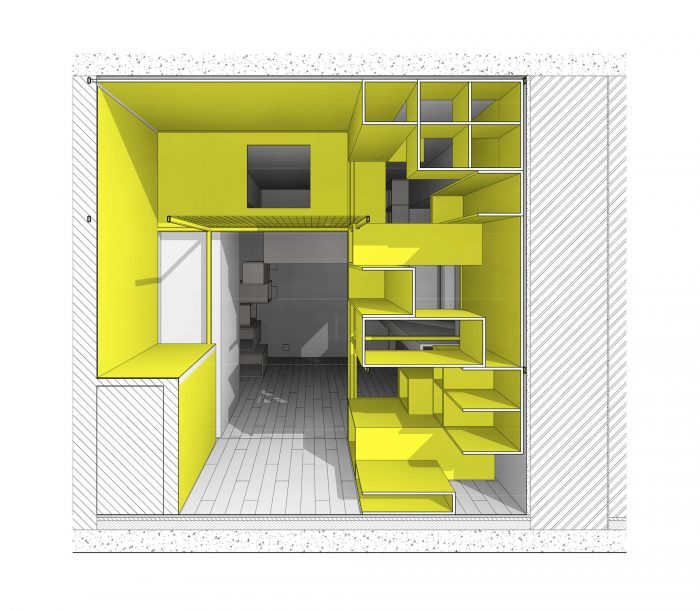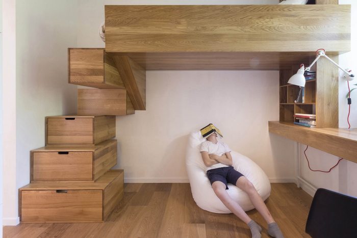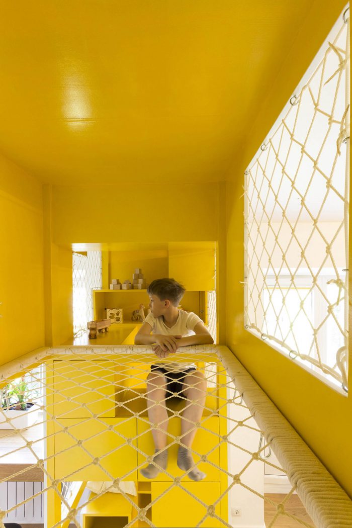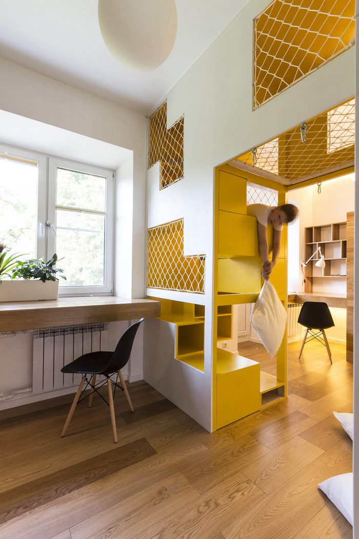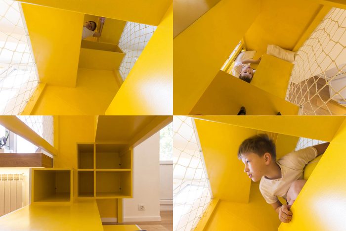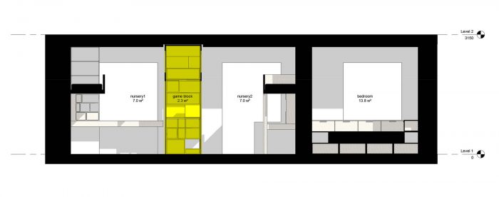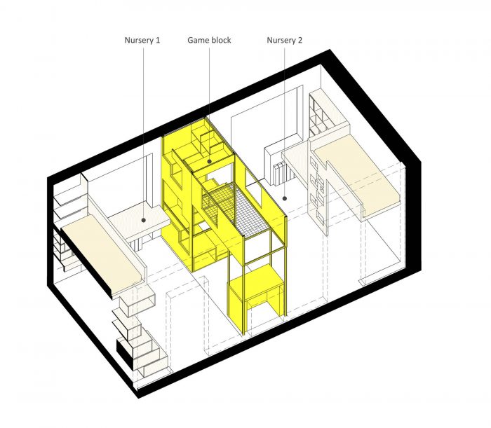 一个16平方米的房间被分配给儿童区。房间被中央的游戏装置分为两部分,其中包括几个供攀爬的层次,一个吊床和带窗户的小房子。在游乐设施的两侧,有睡觉的地方和一张学习用的桌子。