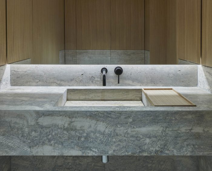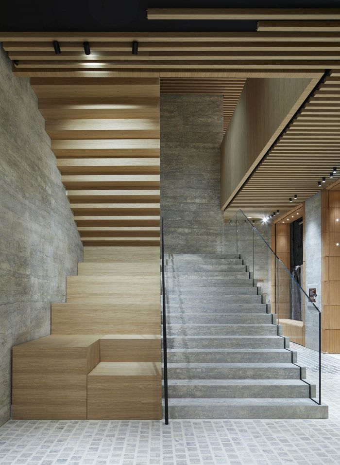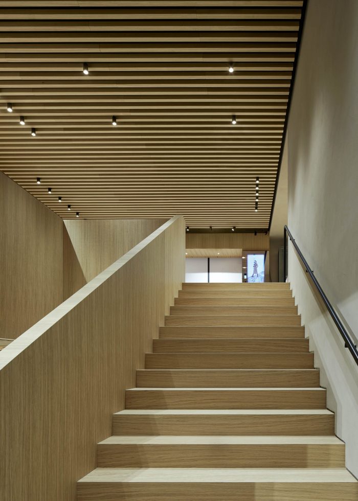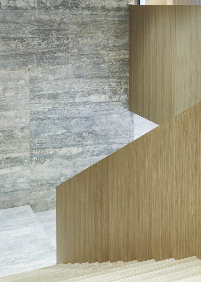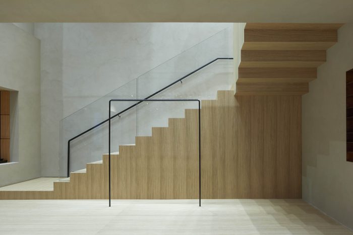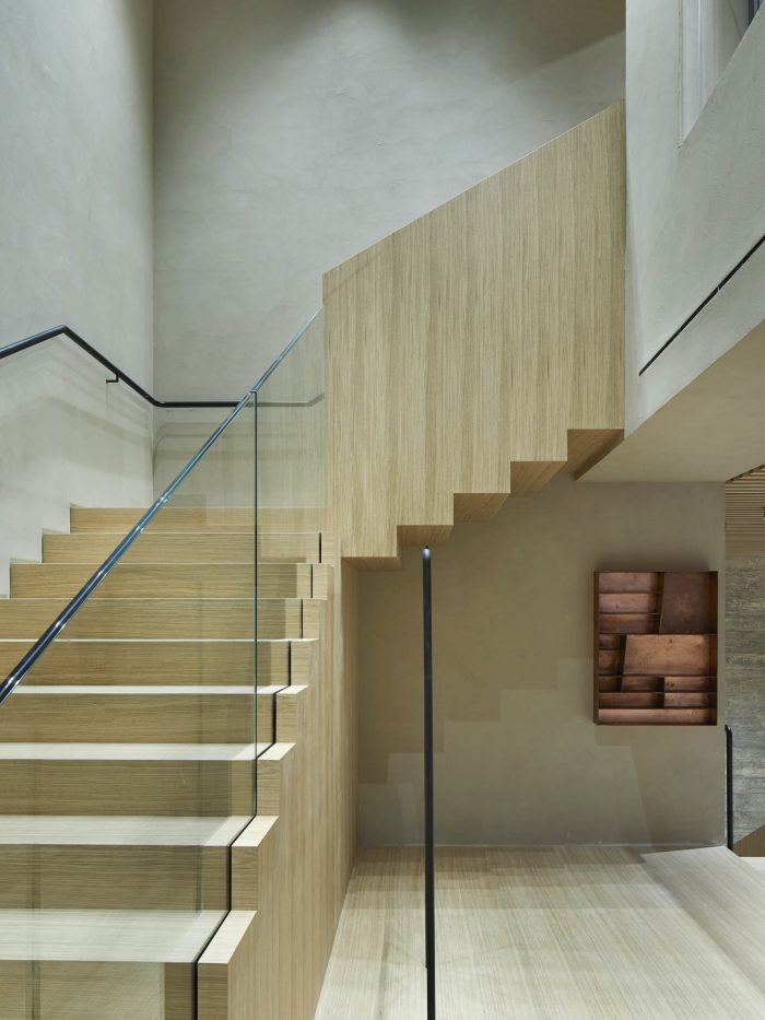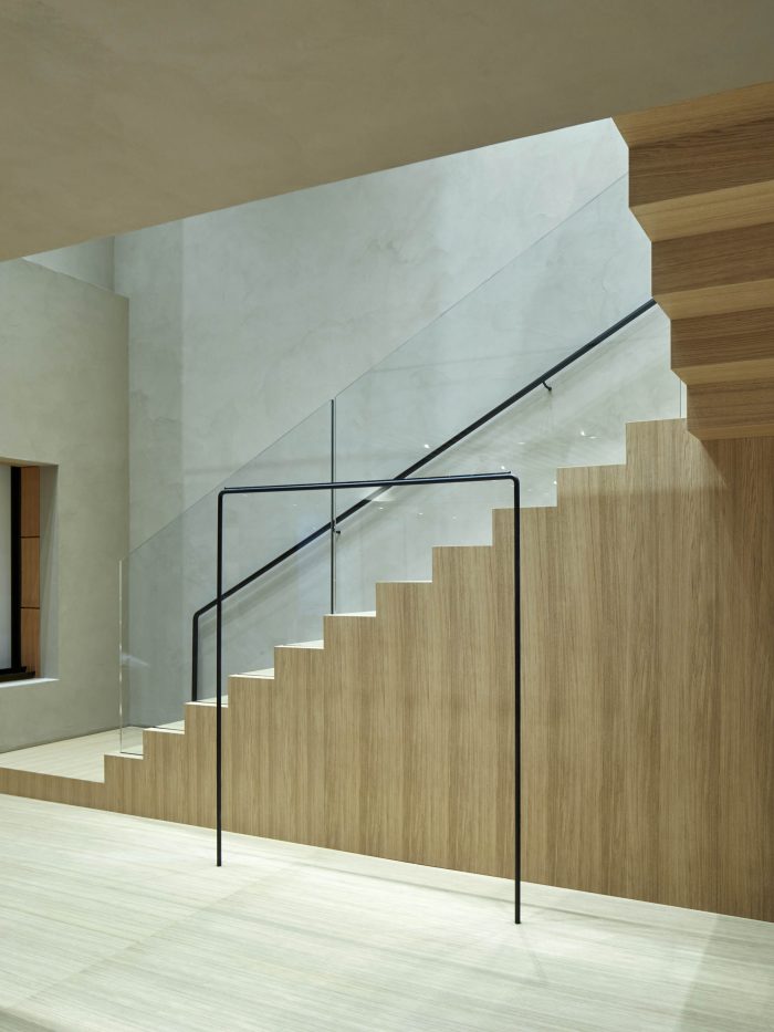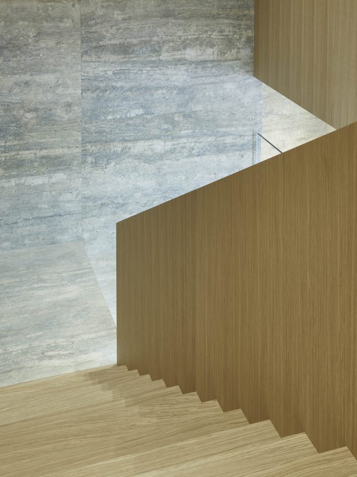 The design of this store is part of Casper Mueller Kneer's re-working of the brand’s worldwide architectural identity. Organized like a large villa, the store extends over three floors over 560m2, with the ground floor being the most open and public, a foyer to the city, with a travertine cobbled floor and silver travertine wall linings. A large central staircase emphasizes the full volume of the space, reaching up to 9 nine meters at its highest point. Moving up to the first floor the materiality of the space changes to a more private, intimate, and cabin-like environment, characterized by European oak paneling and handwoven carpets.