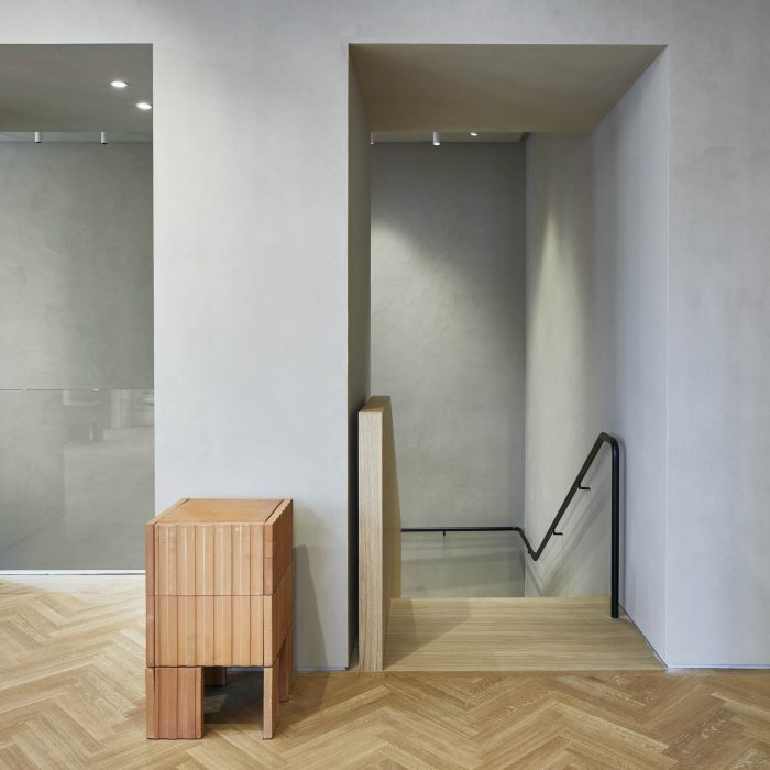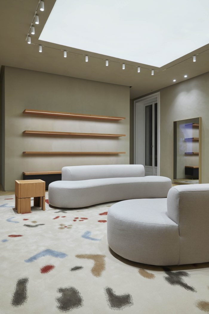 The second-floor womenswear feels like a typical Milanese apartment, with original oak parquet flooring and original windows overlooking the busy street below. The walls of the upper floors are finished in clay plaster with earthy tones. All furniture is custom-designed by Casper Mueller Kneer, including fired clay shelves and stools, as well as a series of wooden display tables.