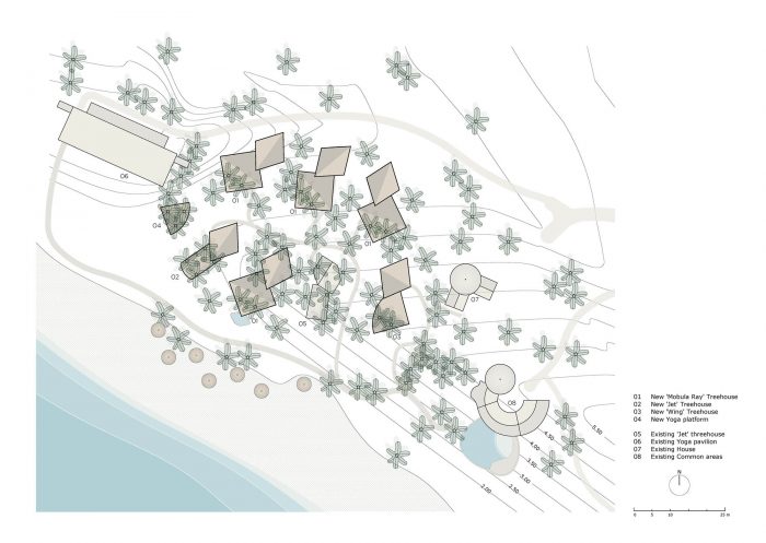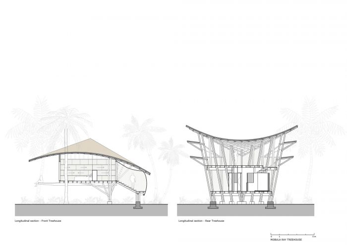 The resort's latest extension includes 6 bamboo treehouses inspired by the flattened, prismatic bodies of the Mobula Rays that migrate past the property's shore. Scattered along the Mexican coastline, the treehouses are perched on coconut palms overlooking the surf. Each treehouse is composed of a master bedroom at the front and an annex treehouse at the rear that contains the bathroom downstairs and a second bedroom/lounge upstairs.