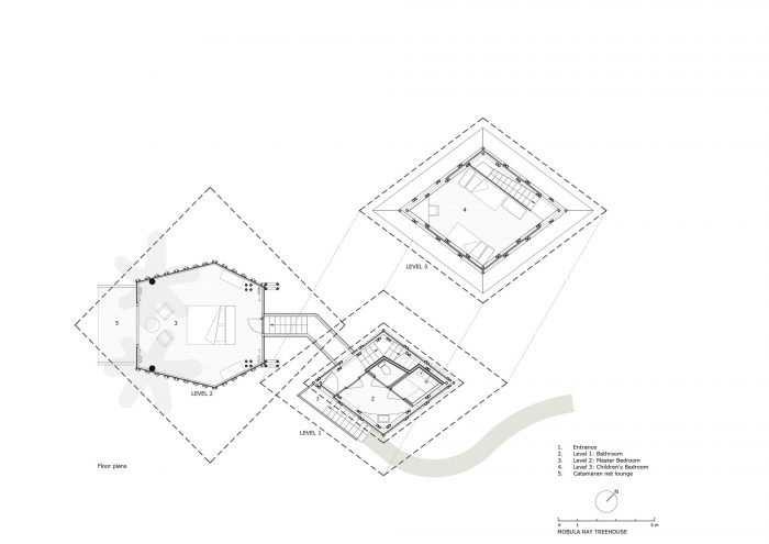 度假村的最新扩建项目包括6个竹制树屋,其灵感来自于洄游经过度假村海岸的莫布拉鳐鱼扁平的棱形身体。这些树屋散布在墨西哥海岸线上,栖息在椰子树上,俯瞰着冲浪。每个树屋都由前面的主卧室和后面的附属树屋组成,后者包括楼下的浴室和楼上的第二个卧室/休息室。