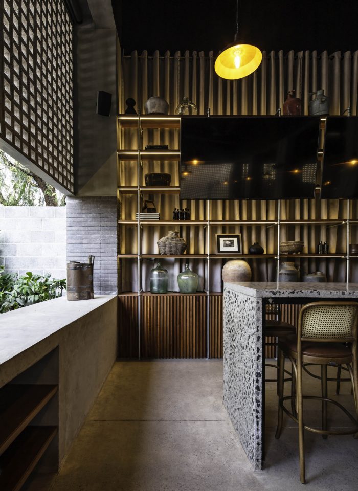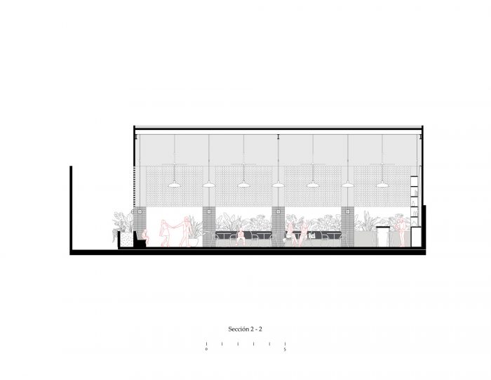 A peculiar detail of the construction was the implementation of a hanging hollow block latticework: an essential element to mitigate sun exposure, moderate the view from the interior towards street traffic, and ventilate the inner smoking area in the terrace. Collectively, the use of simple low maintenance exposed materials, the advantage of natural lighting and ventilation, and the practicality of the open floor plan were also complementary strategies for the fulfillment of this project.