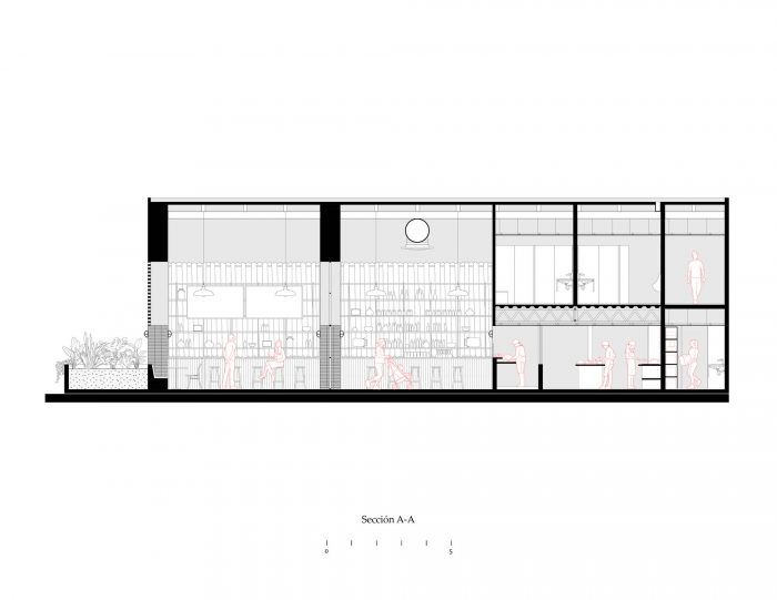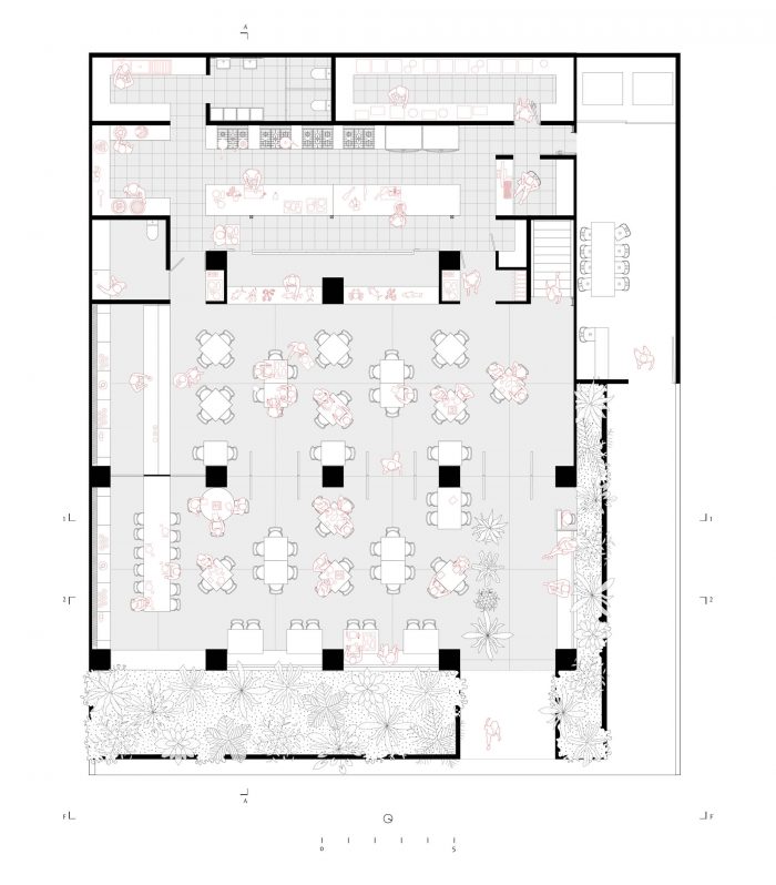 这个方法从一个简单的想法开始:在不改变原有模式或结构的情况下,通过复制其内部的食客容量来扩大现有仓库。基于这些前提,在扩建的仓库和原有的仓库之间开辟了一连串的托架,以便将它们连接起来,以及另一个对称的序列,将两个区域与外部的绿色缓冲区结合起来,作为繁忙的大道和餐厅之间的中介。
